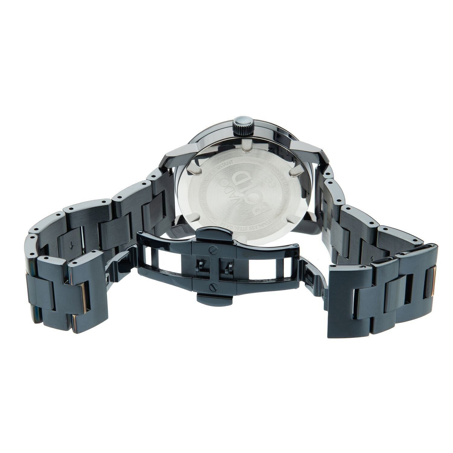Blue ion-plated stainless steel case and bracelet. Fixed blue ion-plated bezel. Blue dial with blue hands. No markers. A crystal-set Movado dot appears at the 12 o'clock positions. Dial Type: Analog. Quartz movement. Scratch resistant K1 crystal. Pull / push crown. Solid case back. Case size: 36 mm. Case thickness: 9.2 mm. Round case shape. Band width: 18 mm. Fold over clasp with a push button release. Water resistant at 30 meters / 100 feet. Functions: hour, minute. Additional Info: in general, withstands splashes or brief immersion in water, but not suitable for swimming or bathing. Casual watch style. Movado Bold Blue Dial Ladies Watch 3600388.