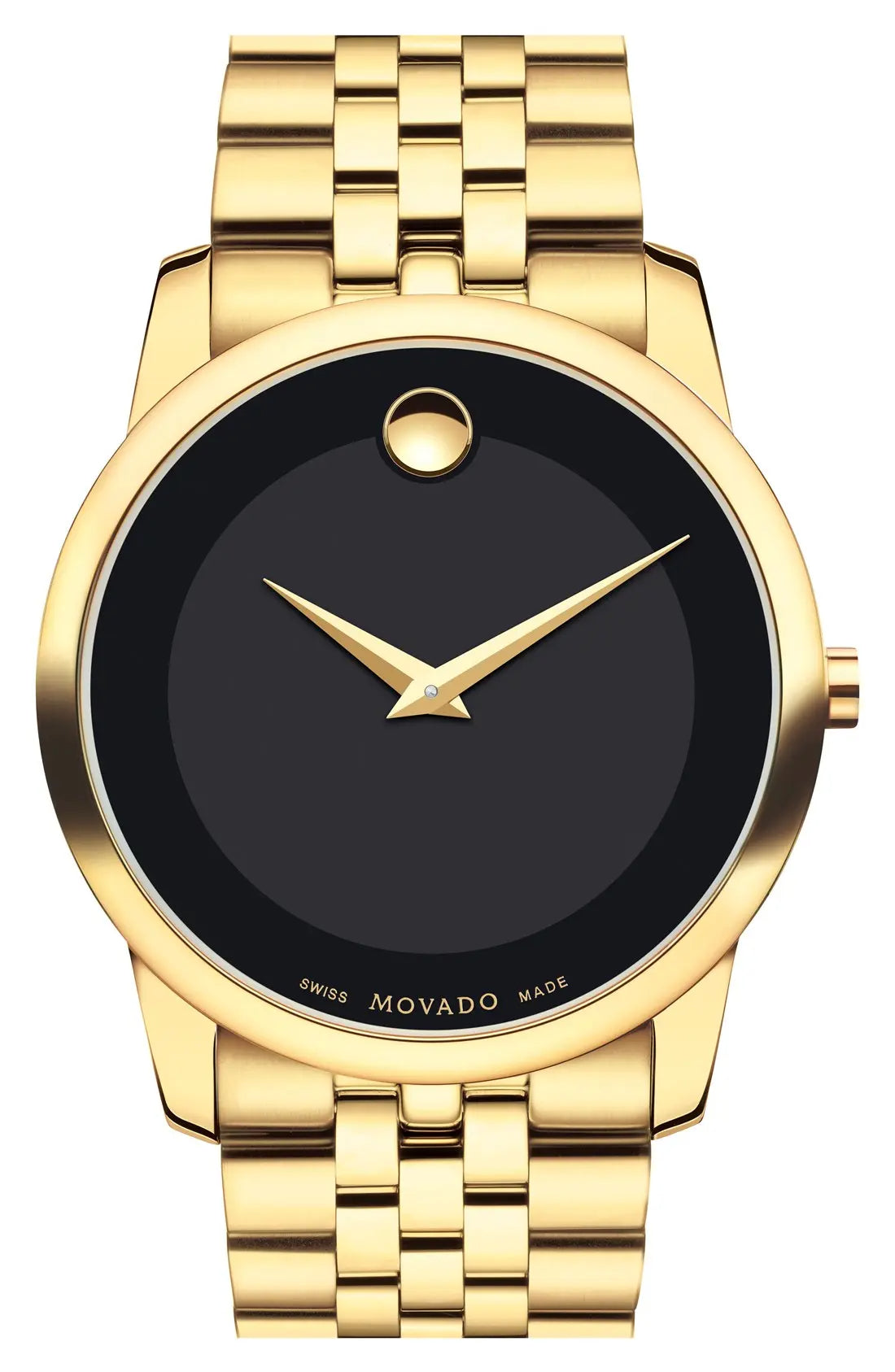 Brand New Authentic Movado Museum Classic Black Dial Yellow Gold PVD Men's Dress Watch Model 0606997. Stainless Steel Yellow PVD case with Yellow Gold Tone Stainless Steel watch band. Folding clasp. Fixed bezel. Dial description: Gold Tone hands with Signature Movado Dot marking the 12 O'clock position on a Black dial.