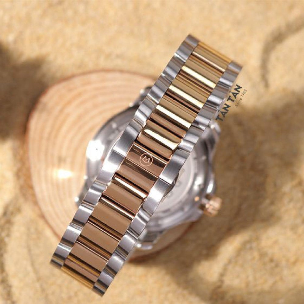 Stainless steel case with a two-tone (silver-tone and rose gold PVD ) stainless steel bracelet. Uni-directional rotating rose gold PVD bezel with a blue aluminium ring. Blue dial with luminous rose gold-tone hands and index hour markers. Minute markers around the outer rim. The Movado dot appears at the 12 o'clock position. Dial Type: Analog. Luminescent hands and markers.