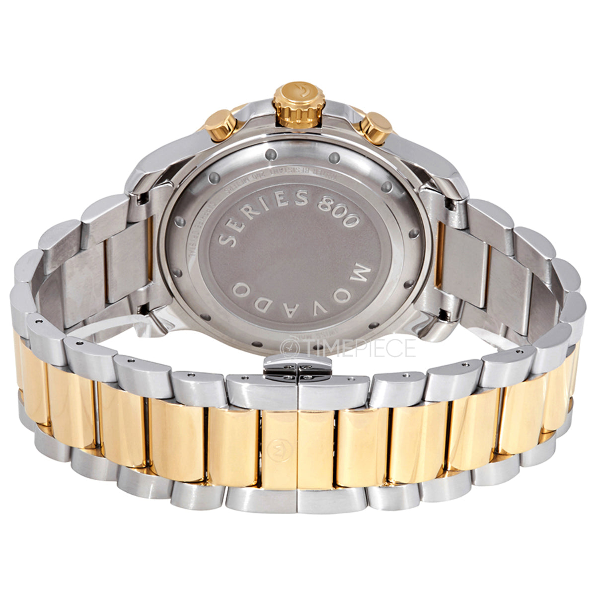 Movado Collection chronograph, 42 mm two-tone yellow gold PVD-finished case and bracelet with deployment clasp, black chronograph dial with yellow gold-toned accents, sapphire crystal, Swiss quartz movement.
