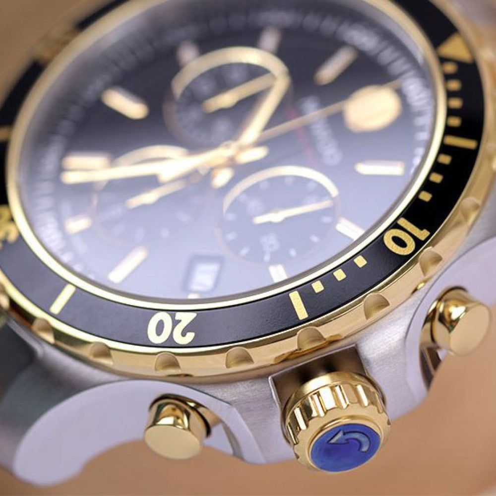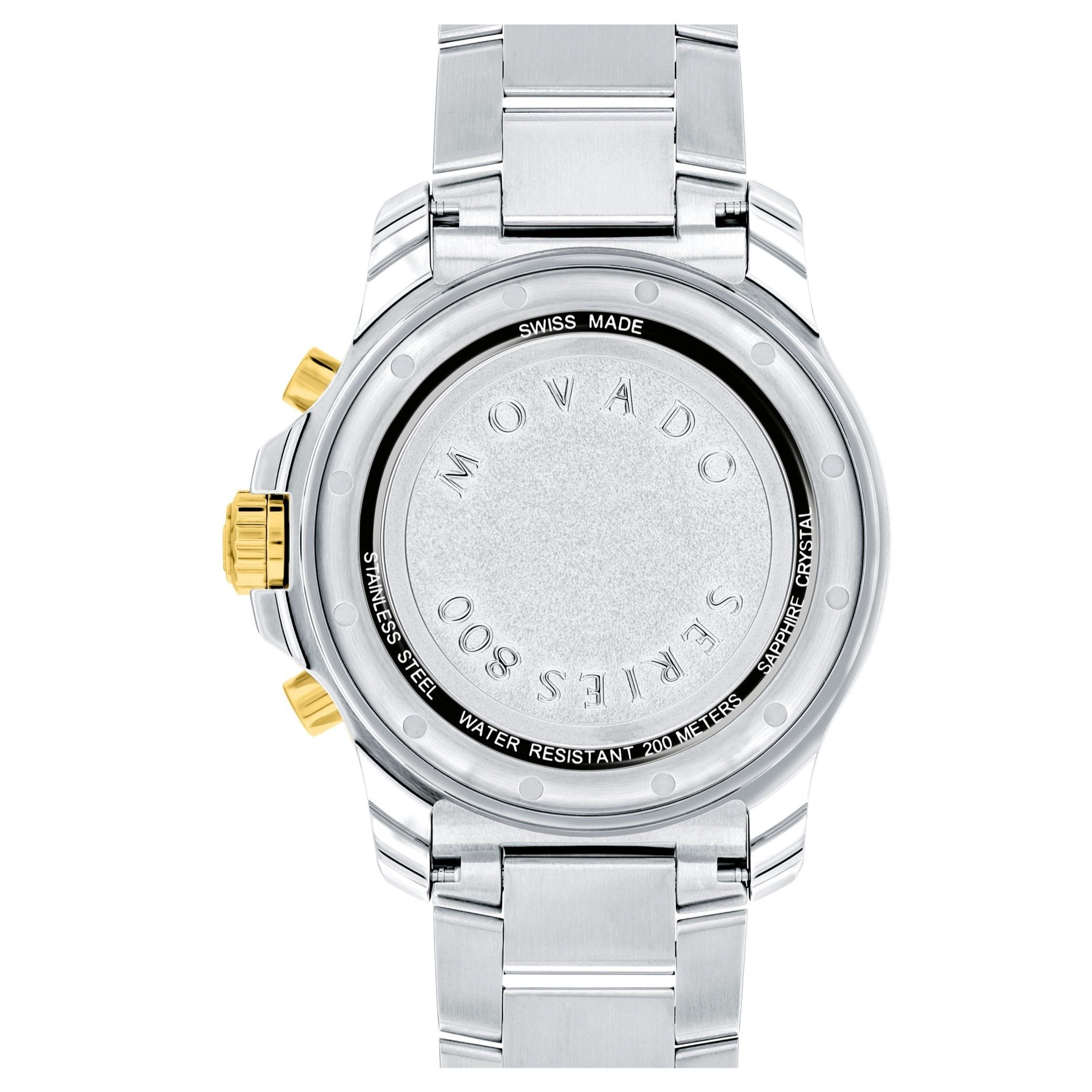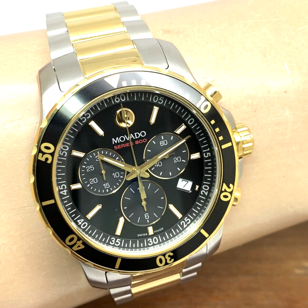 Movado Series 800 2600146 is a super attractive Gents watch. Case material is Two-tone steel/gold plate while the dial colour is Black. The features of the watch include (among others) a chronograph and date function. In regards to the water resistance, the watch has got a resistancy up to 200 metres. This means it can be used for professional marine activity, skin diving and high impact water sports, but not deep sea or mixed gas diving. We ship it with an original box and a guarantee from the manufacturer.