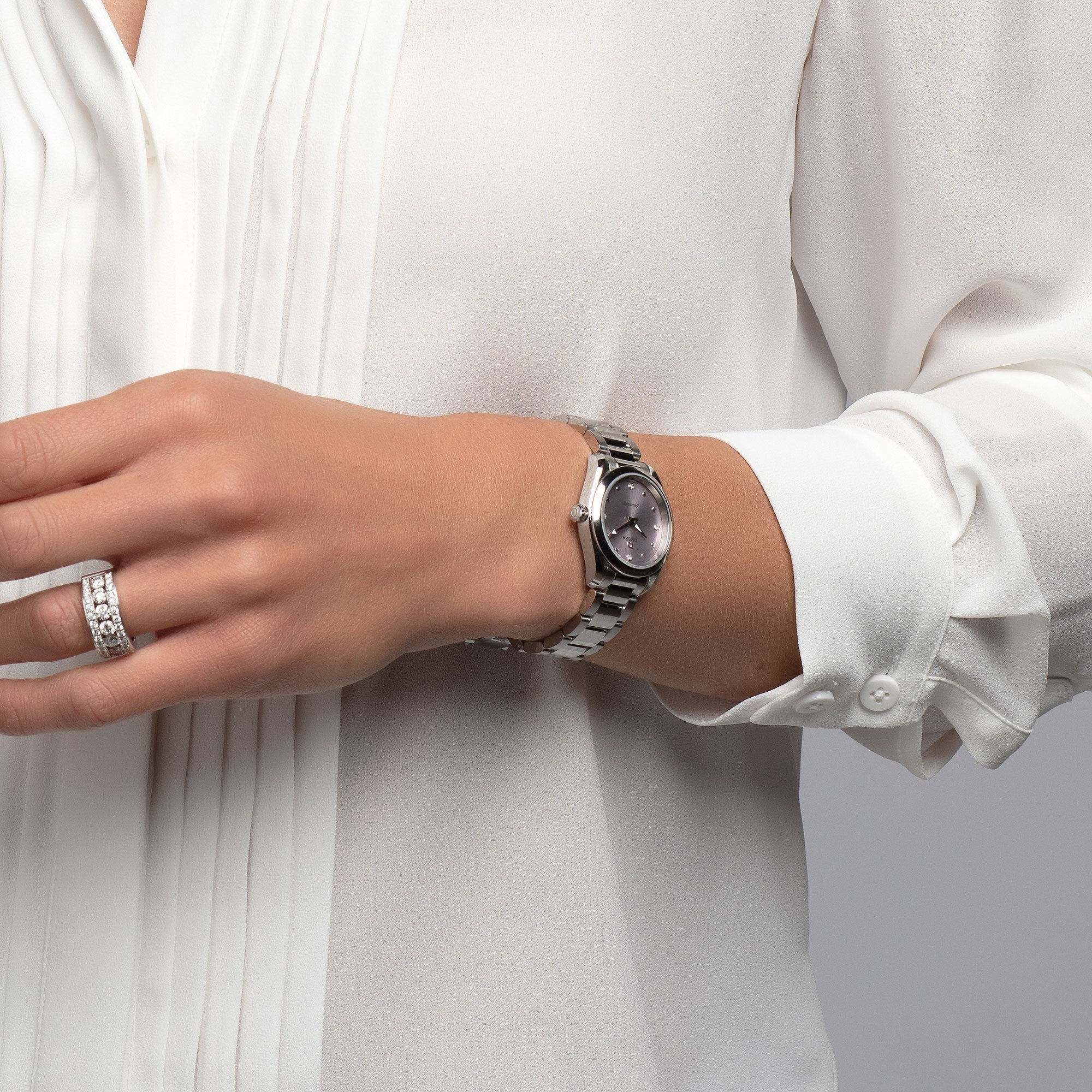 With a symmetrical 28 mm case, this stainless steel model features a glossy lilac dial, 8 dotted rhodium-plated indexes and 4 diamond indexes in rhodium-plated holders. The hands are also rhodium-plated and the caseback is embossed with the OMEGA Seahorse on a wavy background.