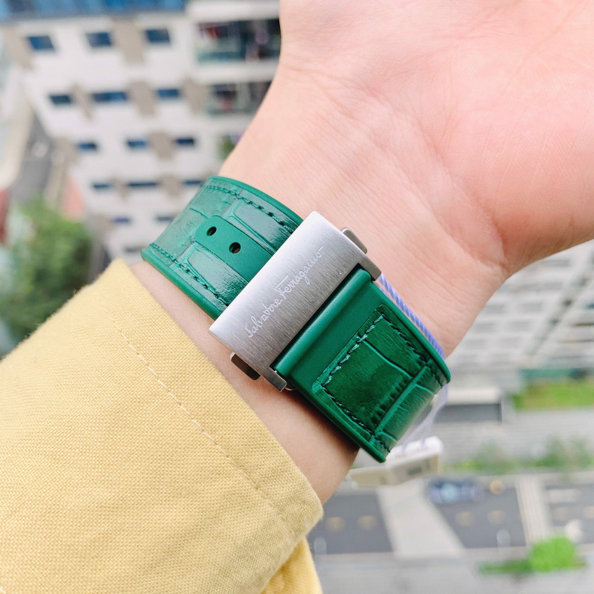 The new F-80 Classic collection comes with a slimmer and smaller case. Its sport-luxury spirit has made it a bestselling Salvatore Ferragamo Timepieces line. Secured by a sapphire glass, the green round dial is housed in a stainless steel case. Moreover, it is fitted with a deployment buckle clasp to ensure a secure fit on the wrist.