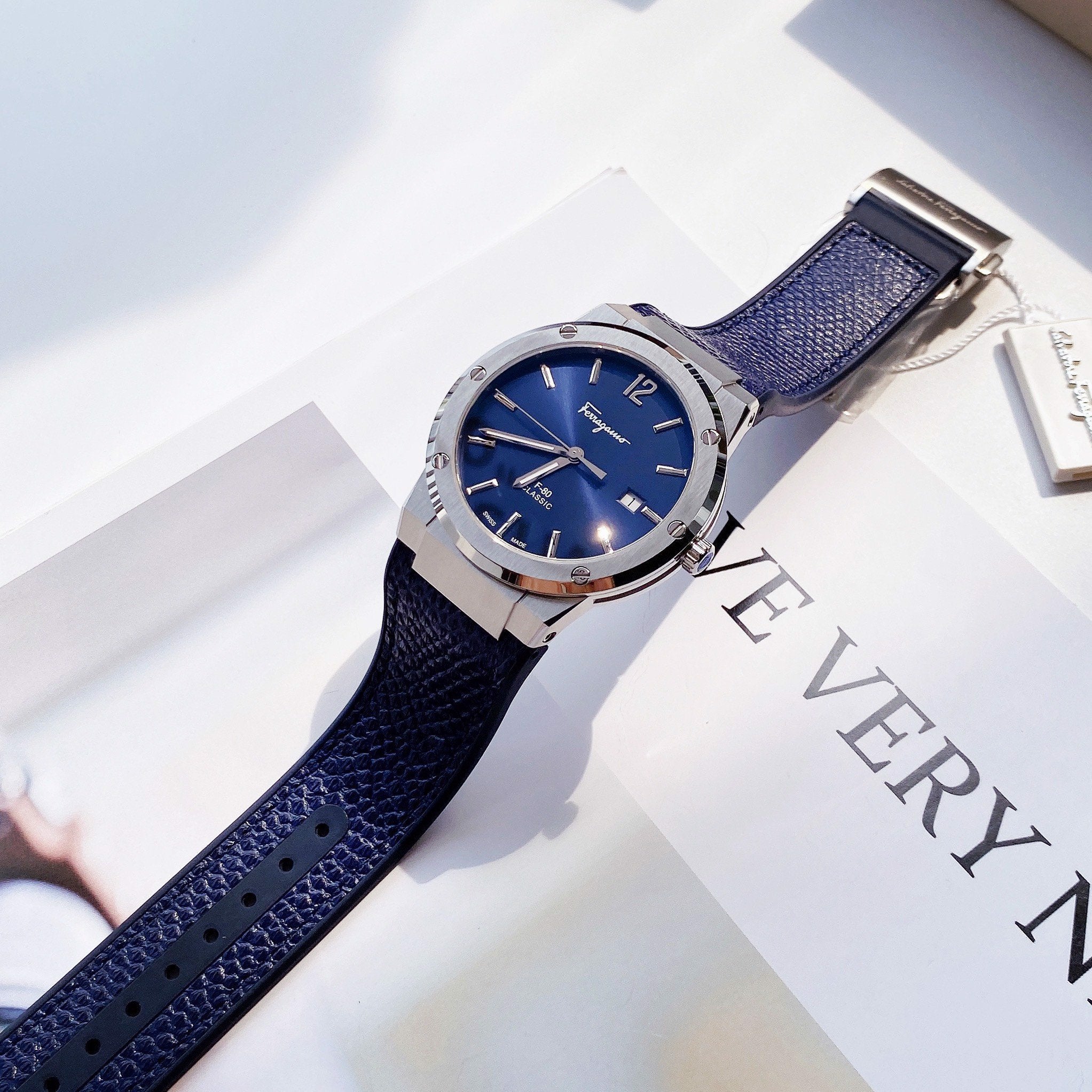 This Salvatore Ferragamo F-80 Classics watch features a sleek blue dial and blue leather strap. With its masculine design and precise timekeeping, this watch is perfect for the modern man. Elevate your style with this luxurious timepiece.