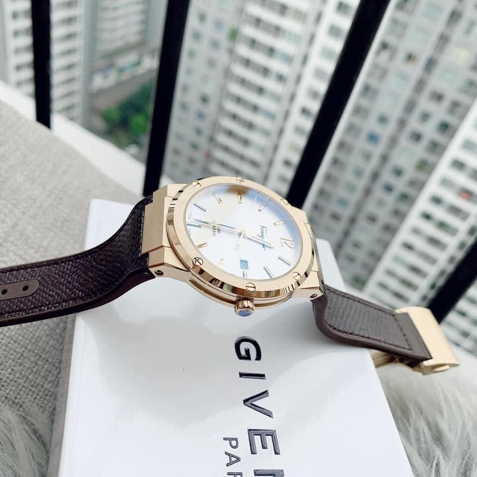 This Salvatore Ferragamo watch boasts a classic white dial and brown leather strap, making it a timeless accessory for men. With its sophisticated design and superior craftsmanship, it exudes elegance and style. Perfect for any occasion, this watch is an essential addition to any gentleman's wardrobe.