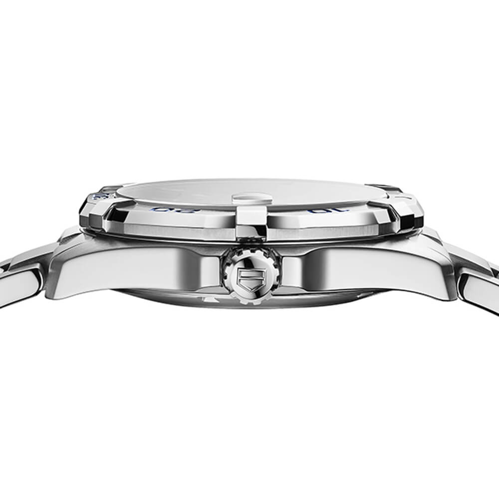 Powered by the TAG Heuer Calibre 5 self-winding automatic movement which boasts a 38 hour power reserve, beats at 28,800 vph and contains 25 to 26 rubies depending on the execution. The dial is protected by a flat scratch-resistant sapphire crystal with anti-reflective treatment. The case is round and 41 mm in diameter. Inlet width: 20 mm. Screw-down crown and case back. Stainless steel folding clasp with diving extension. Water-Resistant to 300 meters / 1000 feet. Functions: hours, minutes, seconds, date. Diving watch style. Swiss Made.
