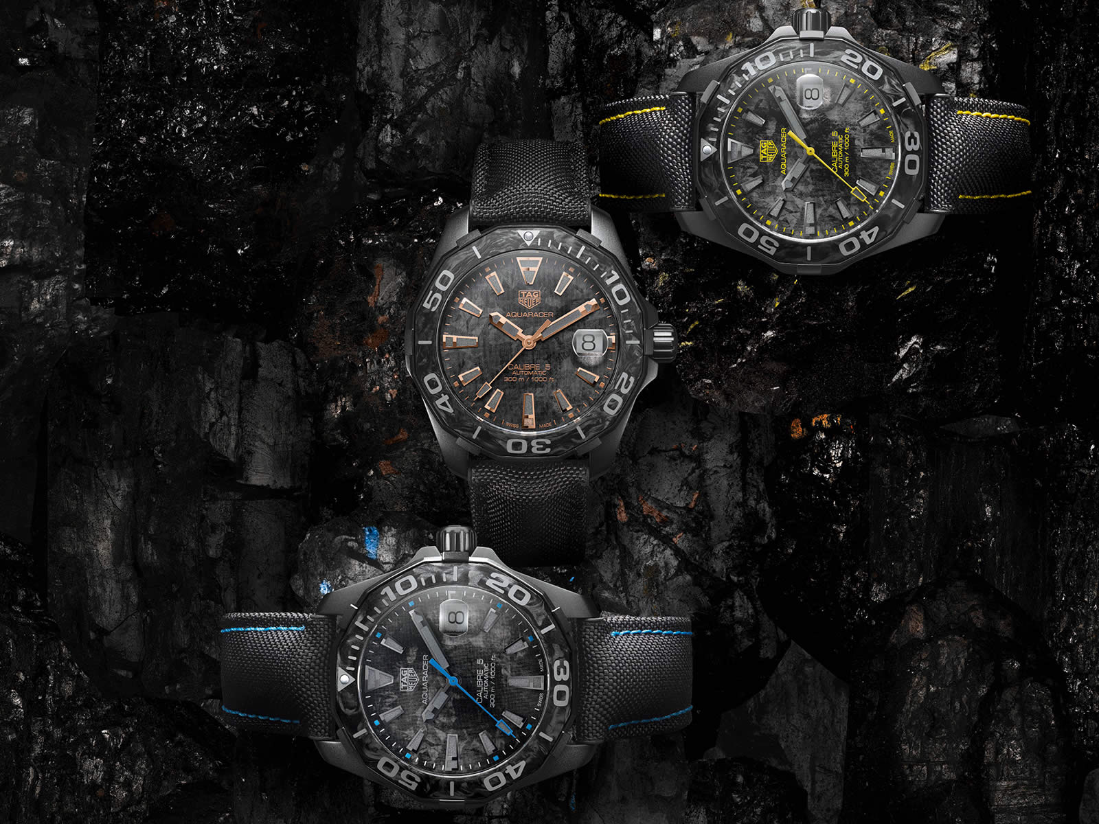TAG Heuer’s collaboration with watch customization maestro George Bamford, announced earlier this year at Baselworld, resulted in the launch of the much-discussed carbon-cased Monaco Bamford special edition. Now TAG Heuer’s sporty diving watch, the Aquaracer, gets a similar all-black carbon treatment, in a trio of new models available exclusively at brand boutiques and online.