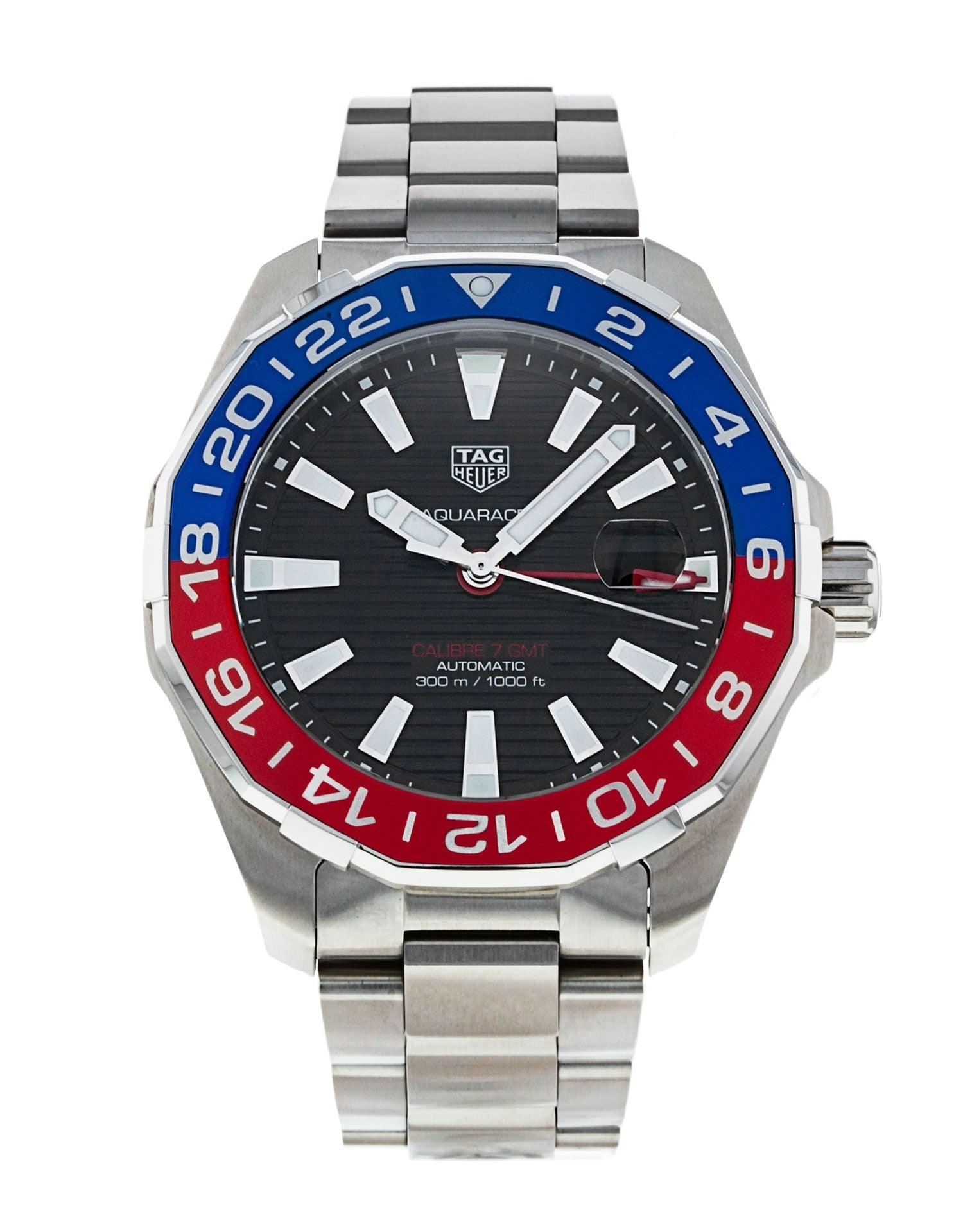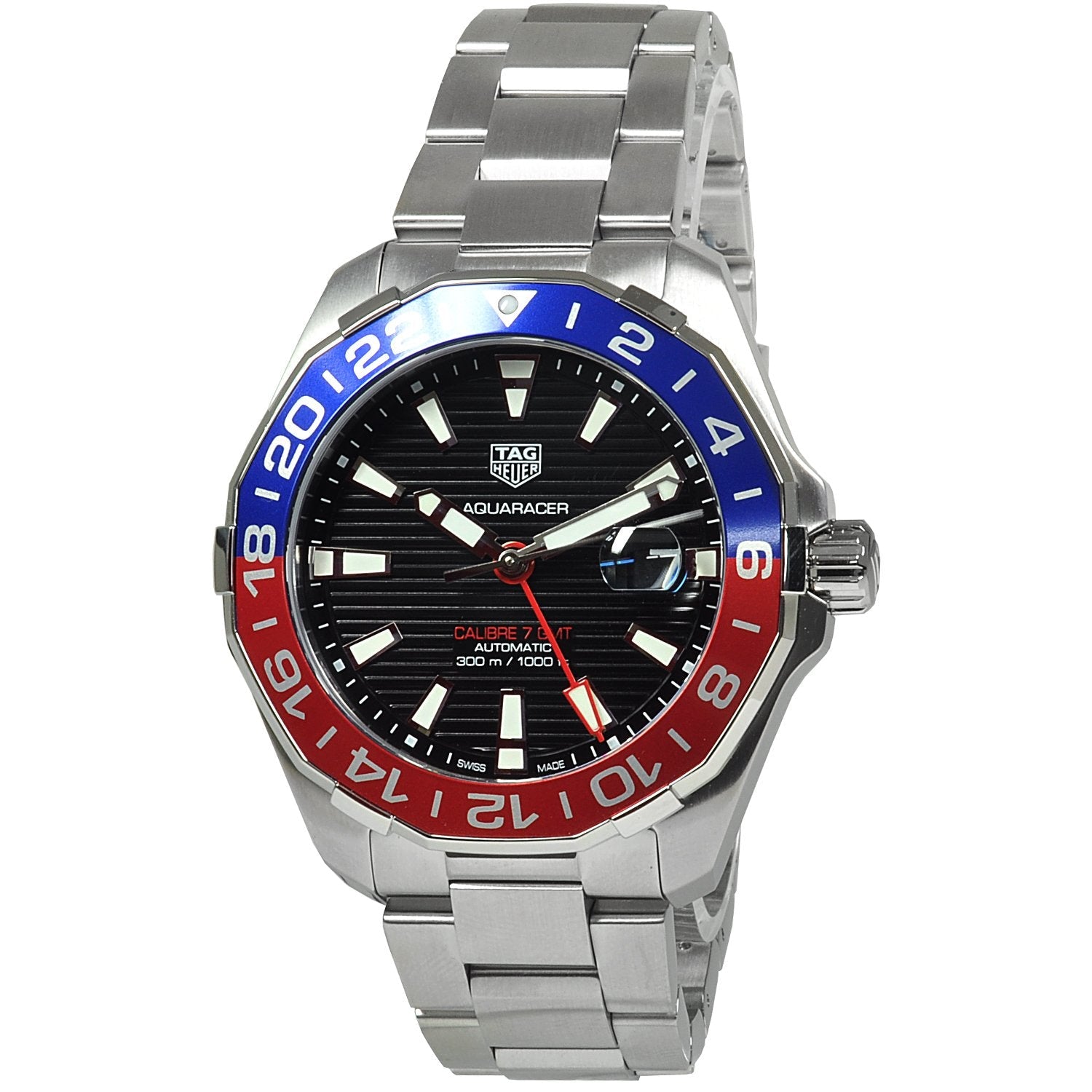 TAG Heuer Aquaracer Caliber 7 Automatic WAY201F.BA0927 men’s watch. Round brushed with polished stainless steel case on a brushed stainless steel bracelet. Black opalin dial. White Super-LumiNova filled luminescent index hour markers and hands. Bidirectional rotating polished red and blue aluminum bezel with 24 hour scale. Date feature with magnifying lens and rapid date correction located at 3 o’clock. GMT second time zone feature. Powered by the TAG Heuer caliber 7 self-winding automatic movement which boasts a 42 hour power reserve.