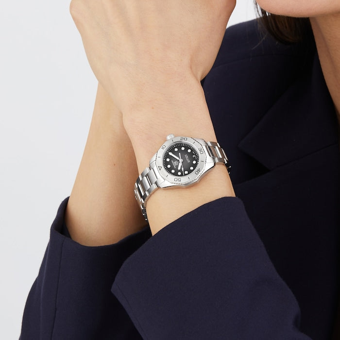 Refined ergonomics and case finishing add to the technicity of this 30mm steel TAG Heuer Aquaracer, made to overcome your personal limits.