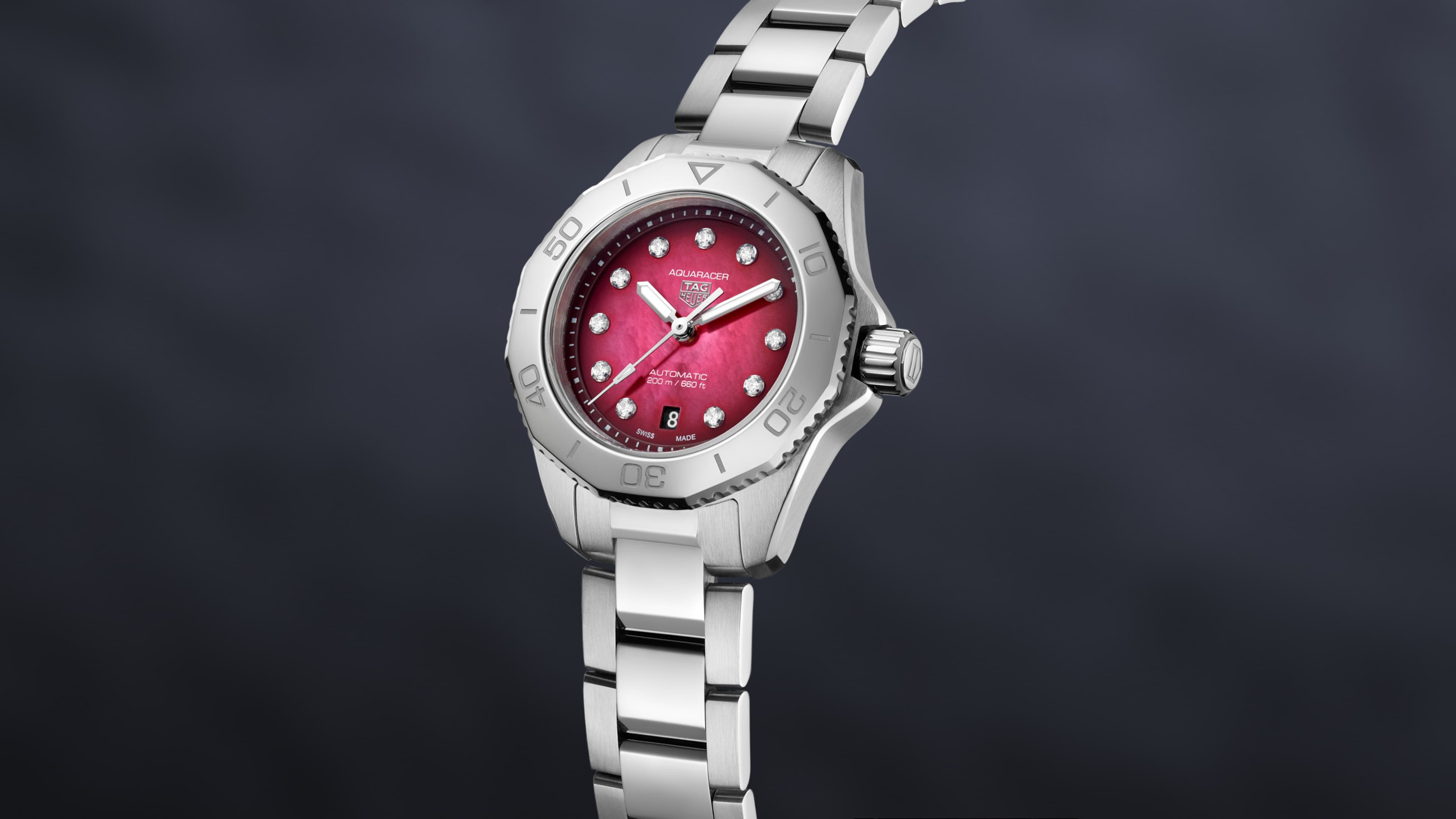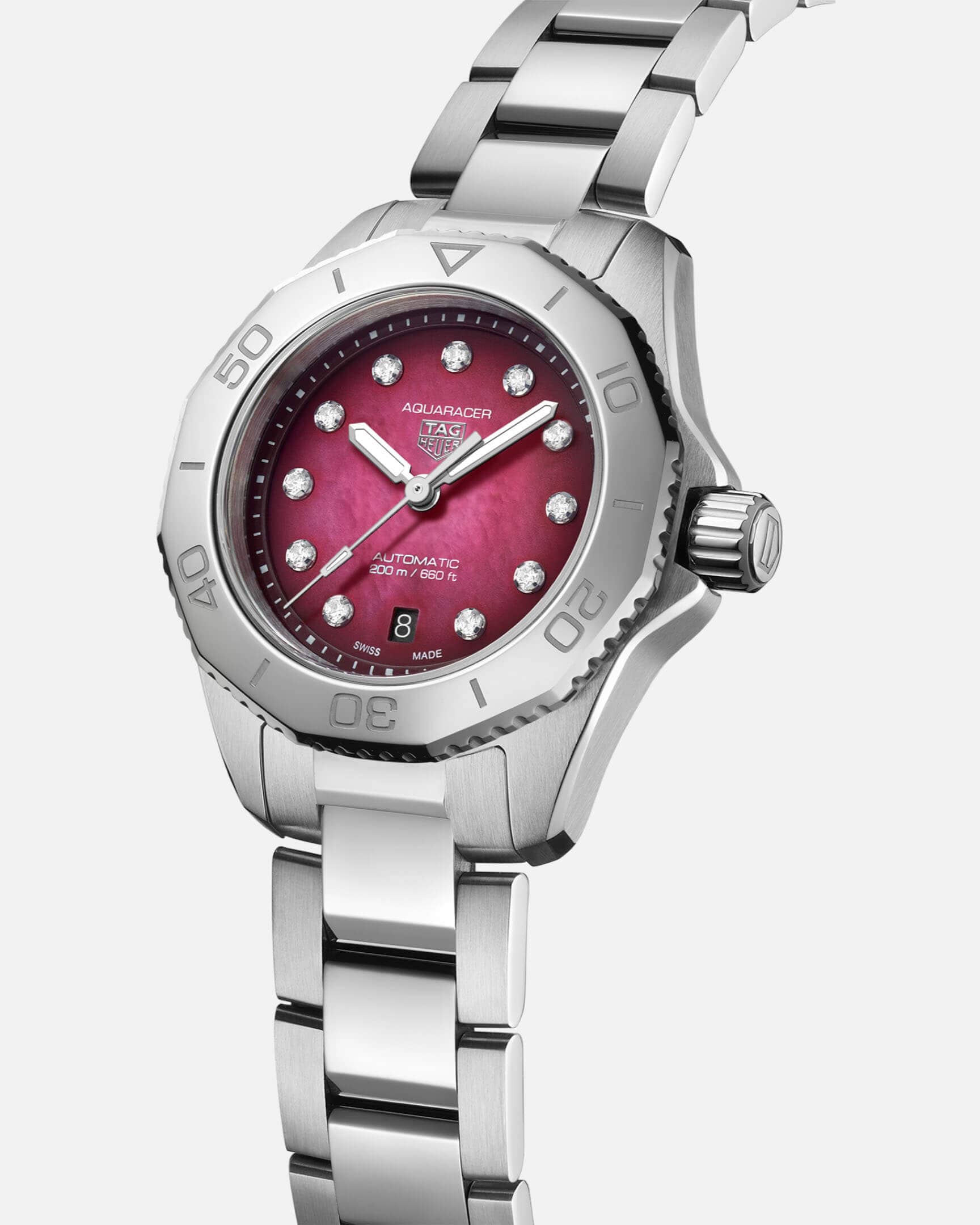 Embrace the warm colours of autumn with this 30mm TAG Heuer Aquaracer and its intense ruby-red mother-of-pearl dial, elegantly set with eleven VS 1.4mm-diametre diamonds (0.107 ct). Crafted in unbreakable steel, this luxurious timepiece can withstand any feat.