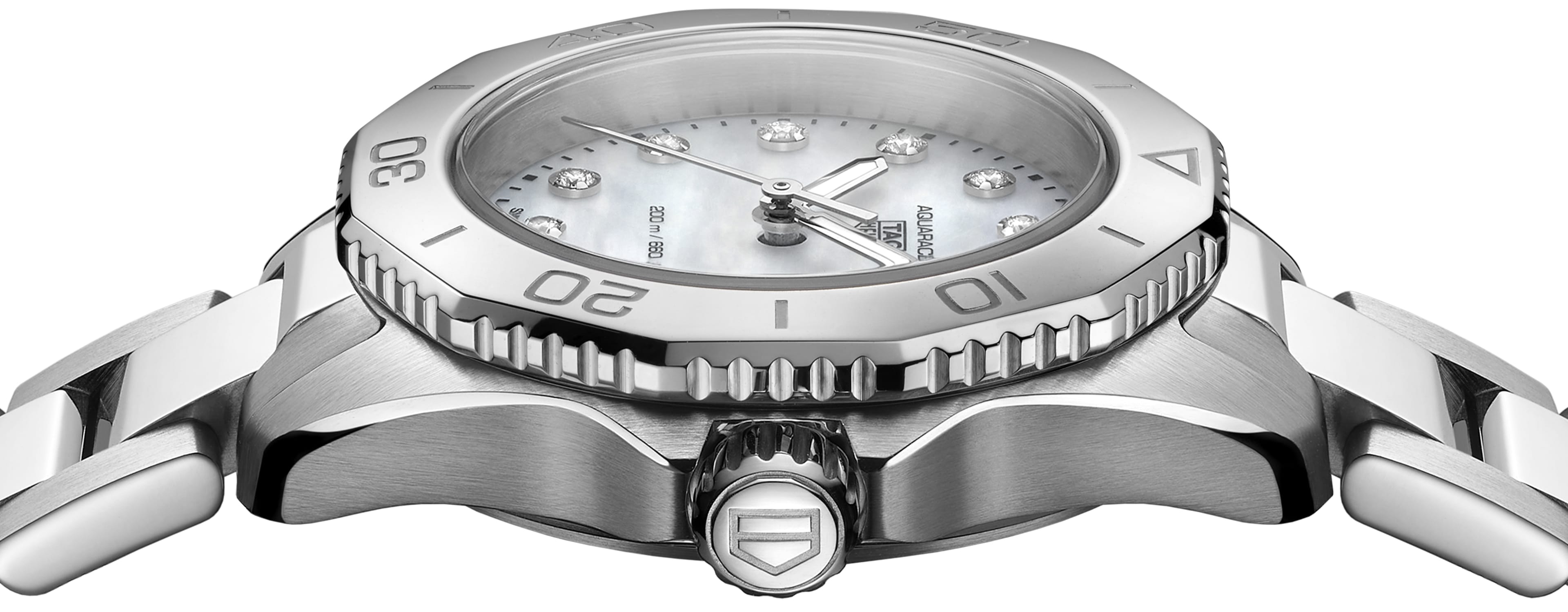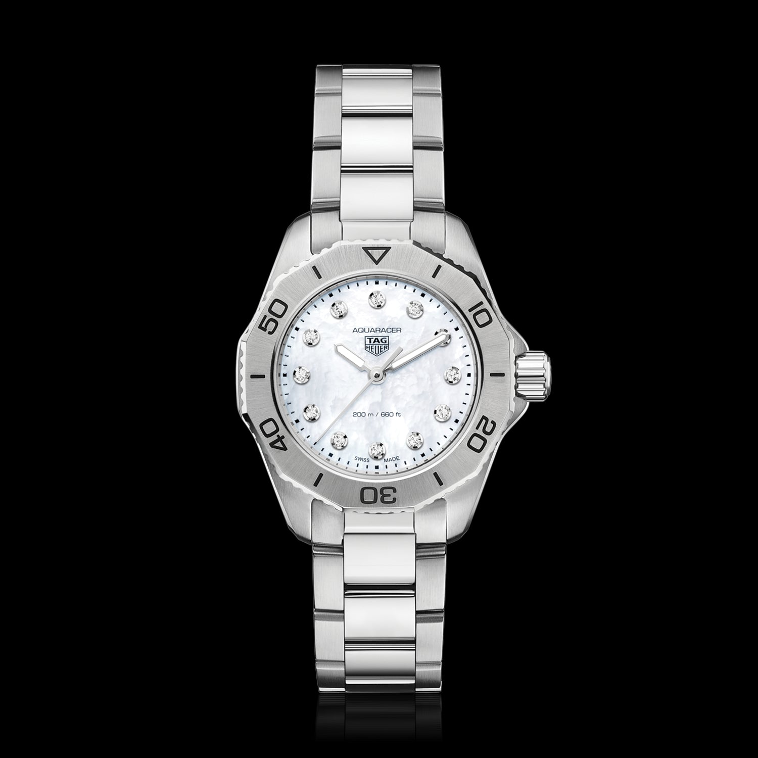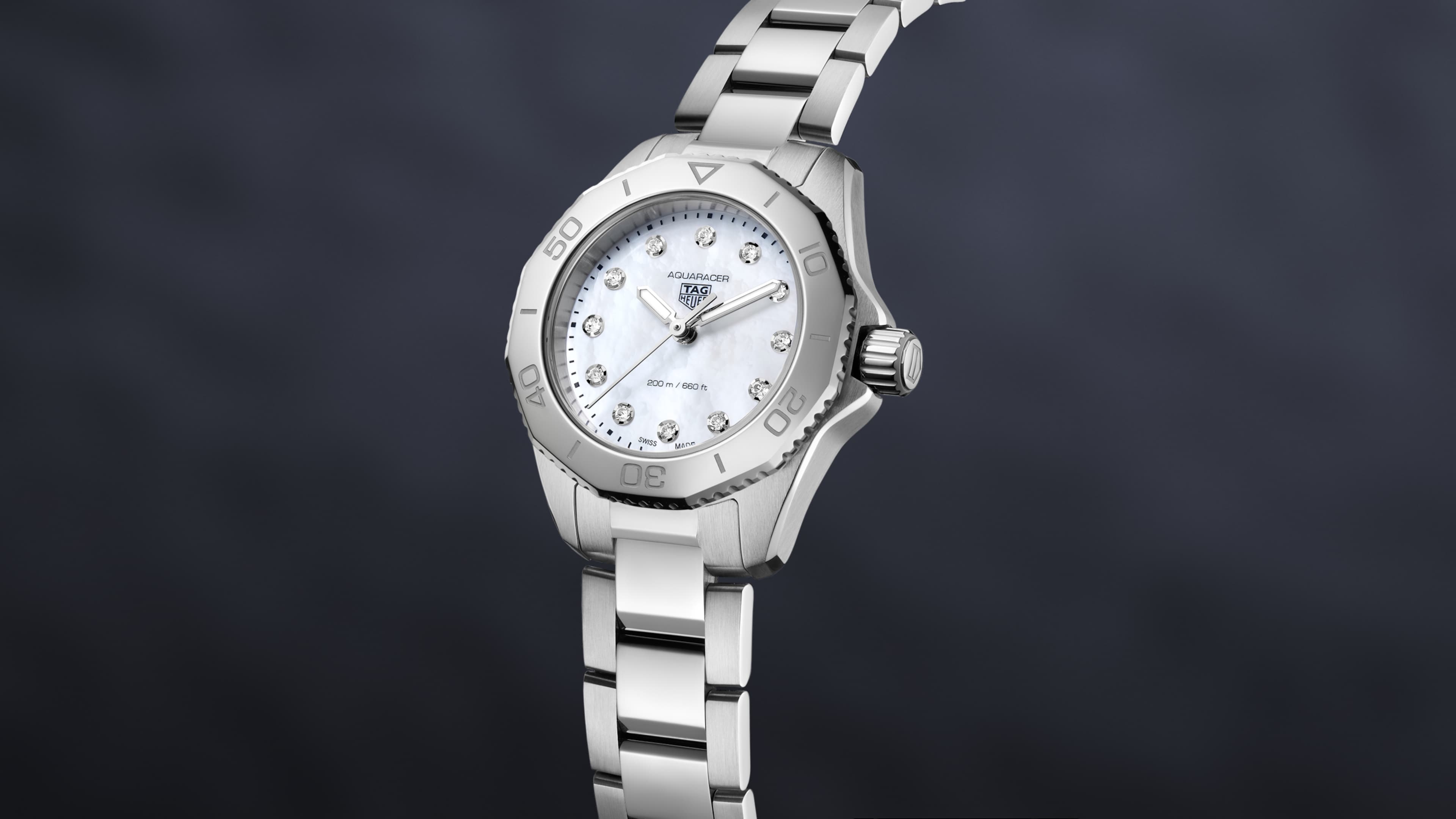 This TAG Heuer Aquaracer adds some sparkle to the versatile everyday companion. In addition to the diamond hour markers on of this 30mm watch, the dial itself is made from mother of pearl. A perfect incentive for going beyond the limits.
