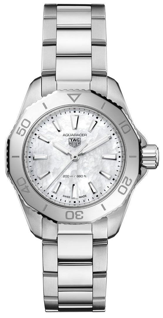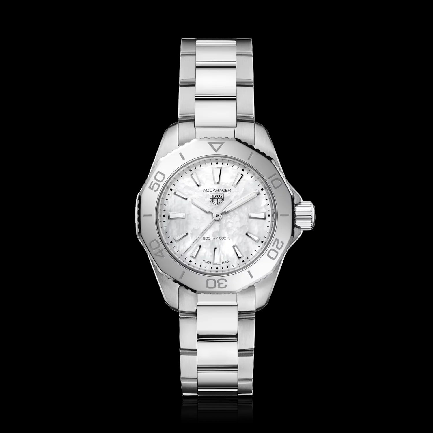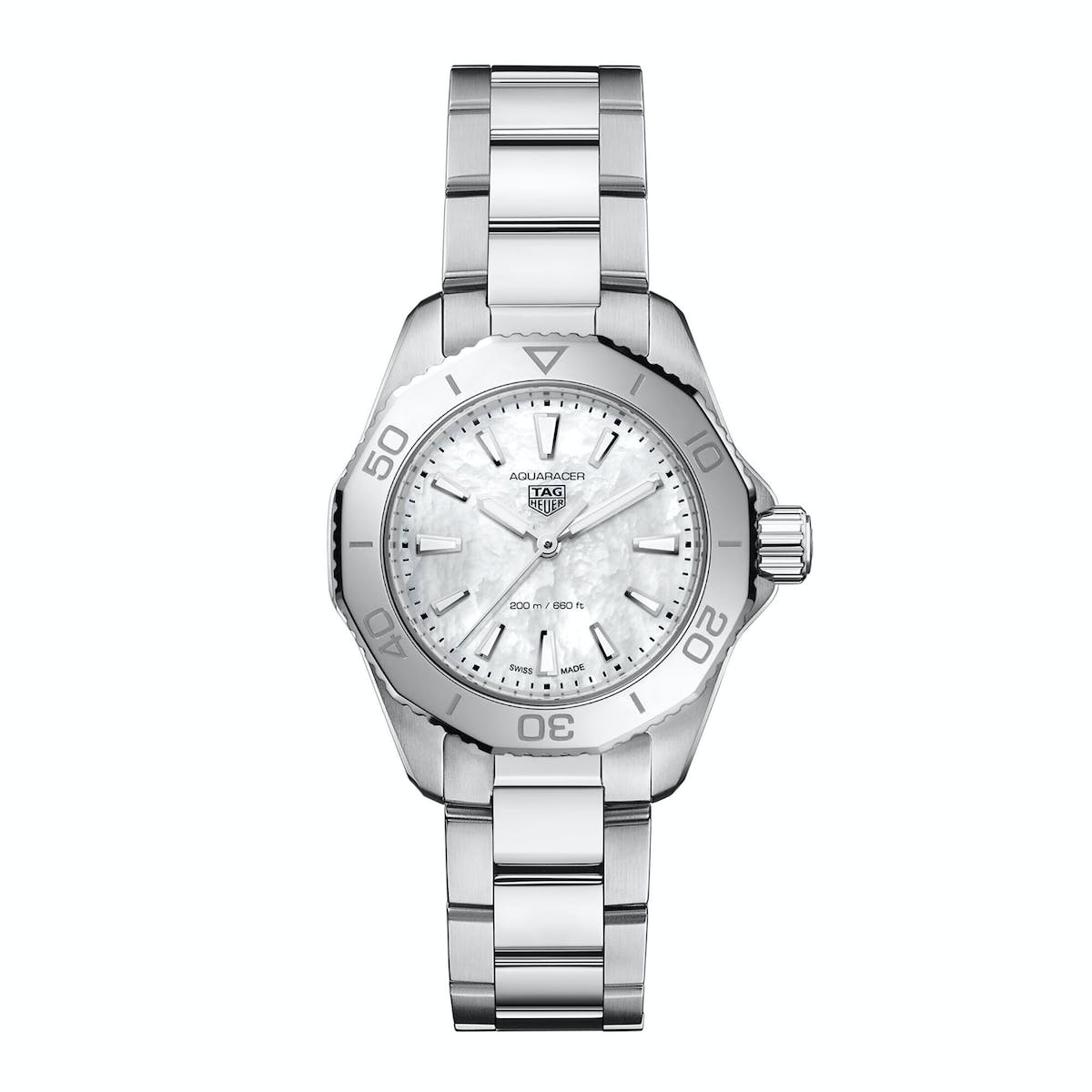 Featuring a delicate white mother-of-pearl dial, this 30mm TAG Heuer Aquaracer strikes the right balance between elegance and technicity. With its ultra-resistant steel case, 60-minute scale bezel and bracelet, this timepiece is eager to go further.