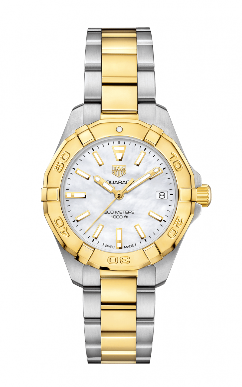 Petite in size (27mm) and plated with gold (2N) and diamonds (0.4358 CT), yet also richly endowed with sports pedigree. Water resistance to 300 meters, diving extendible bracelet and luminescent hands for enhanced readability.