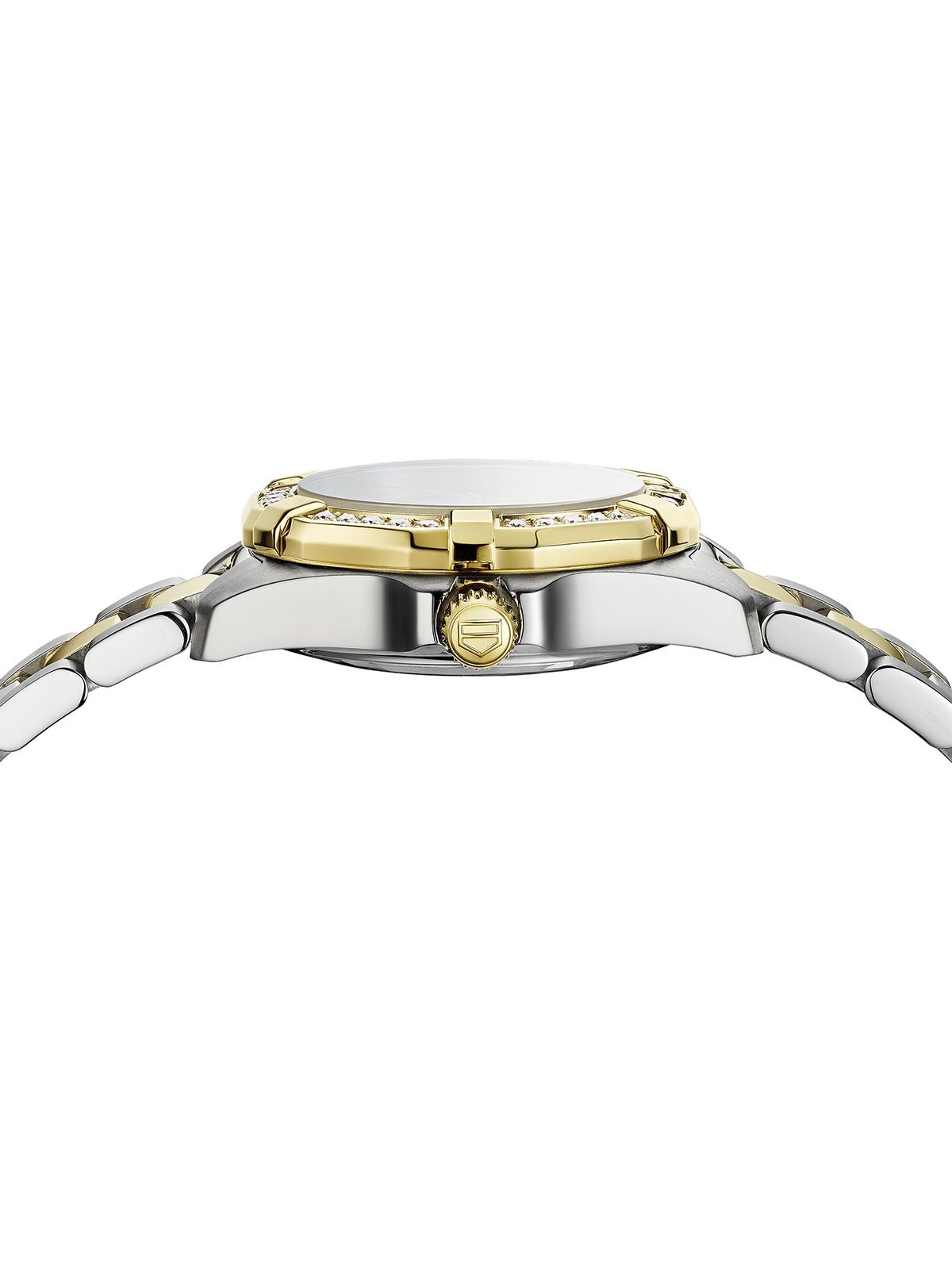 The white mother-of-pearl dial has gold-plated indexes, 11 of which are adorned with diamonds. Thirty-five more diamonds grace the gold-plated unidirectional turning bezel.