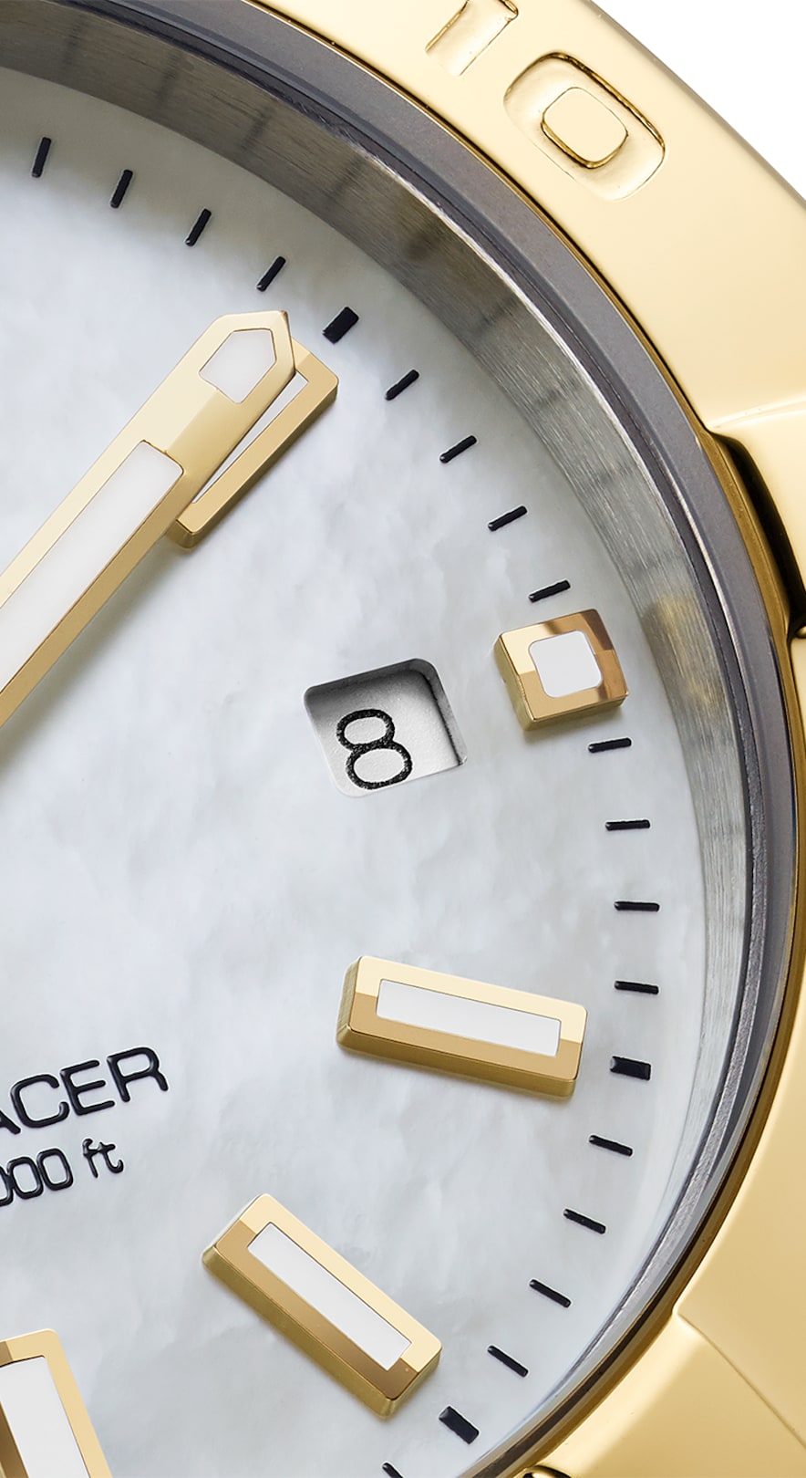 Make an entrance with this dazzling combination of steel and gold. Discreetly sized at 27mm, it features a 18K gold-plated unidirectional turning bezel and screw-down crown at 3 o’clock. The dial is white mother of pearl.