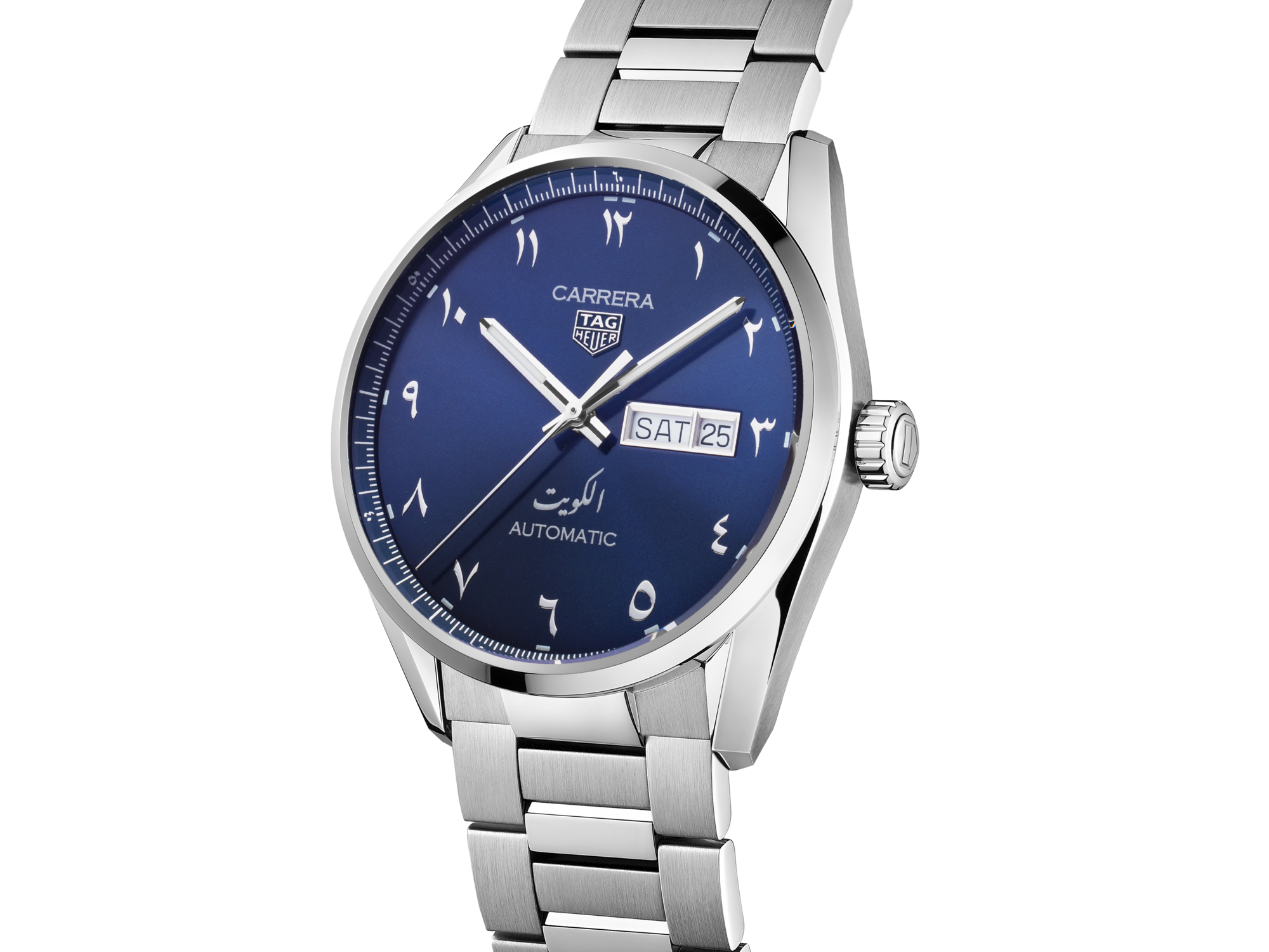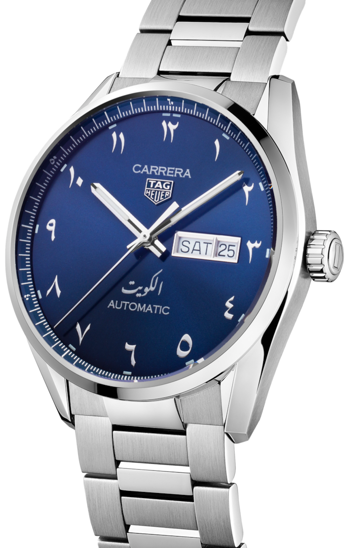 The 41-mm TAG Heuer Carrera Kuwait Limited Edition combines elegance and modernity. Kuwaiti codes are seamlessly integrated in this creation with the blue sunray brushed dial featuring Kuwait Arabic writing and unique Arabic numerals applied indexes.