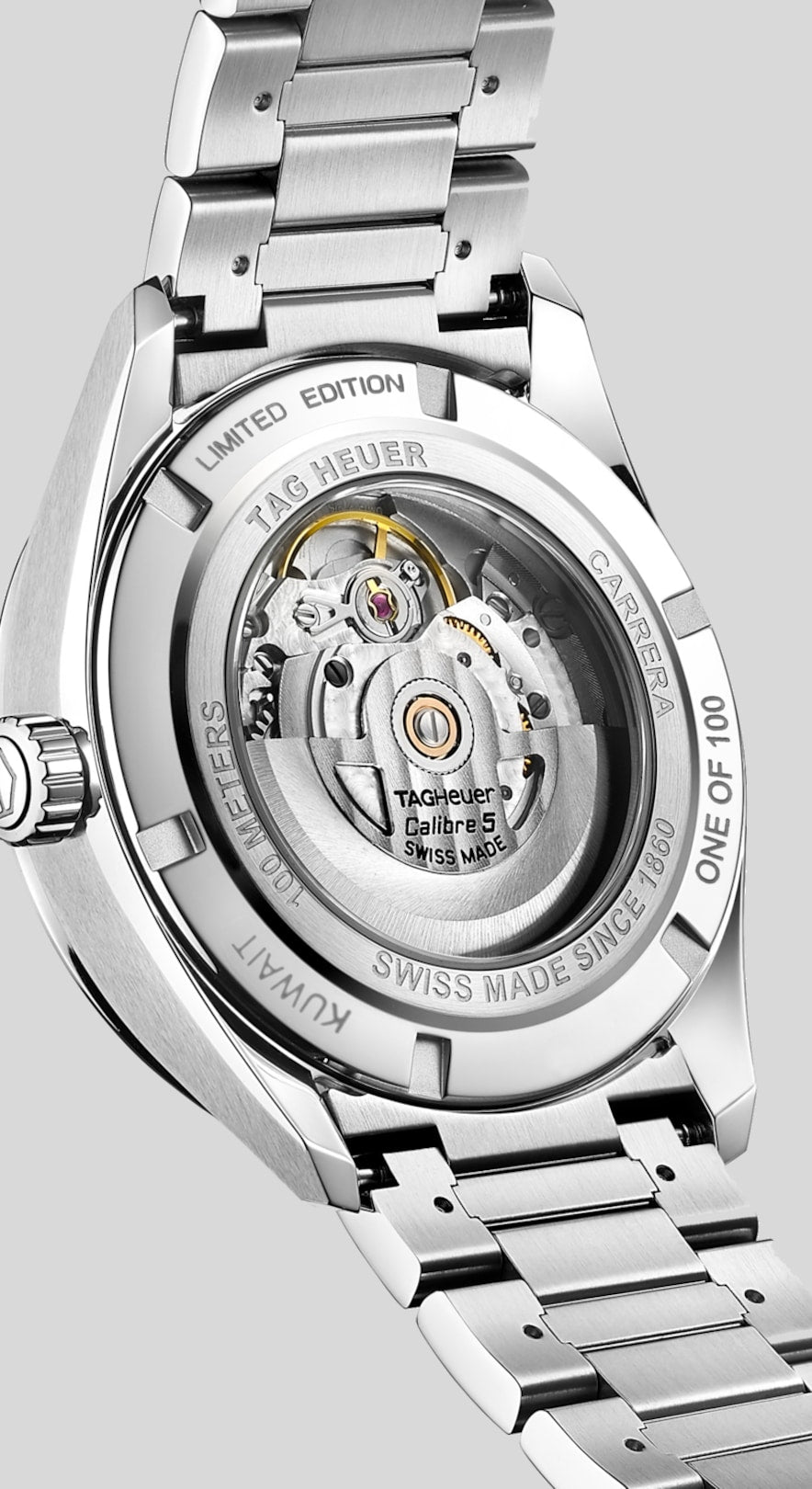 The Calibre 5 Automatic powers the TAG Heuer Carrera, visible through the sapphire case back. A true collectors’ watch, each is inscribed with an exclusive engraving mentioning “KUWAIT”, “LIMITED EDTION” and “ONE OF 100” on the case back.