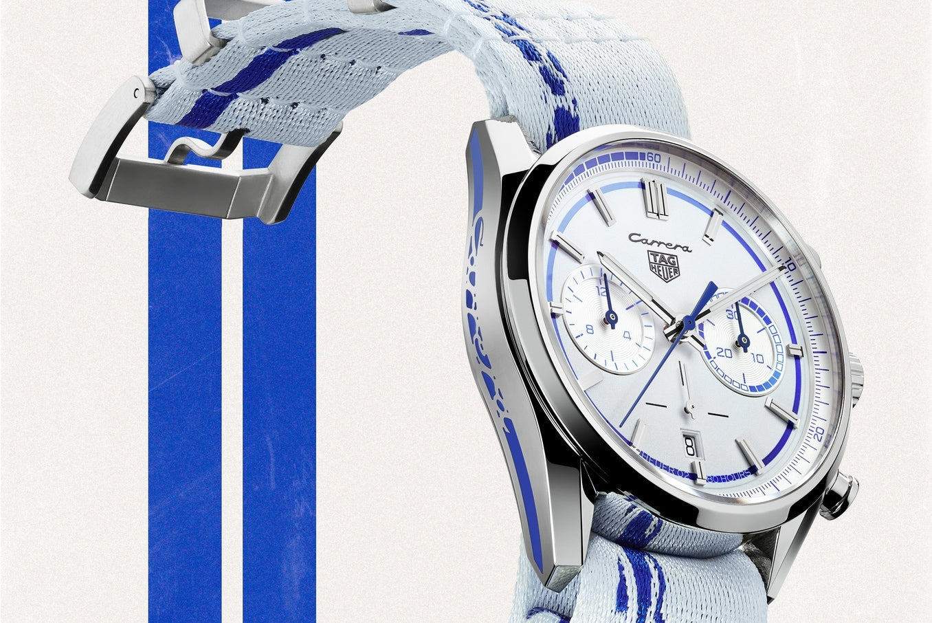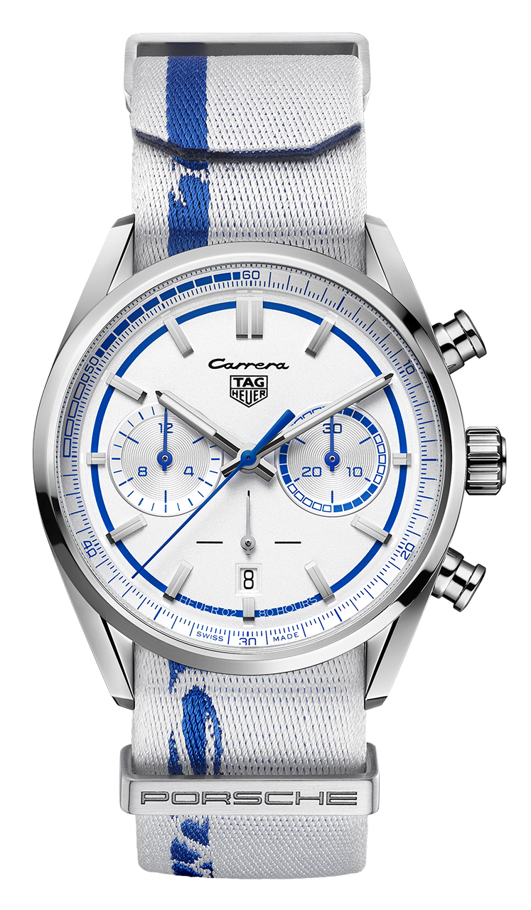 Inspired by the instantly recognisable, mythical Porsche, the crisp white dial is accented with vibrant blue details and further accented by bold Carrera branding.