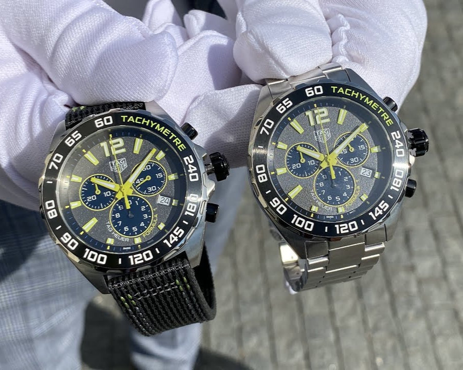 Take the victory with this 43mm racing chronograph, an energetic take on the TAG Heuer Formula 1. Feel the rush of the grey textured dial matched with bold lime yellow accents, and ceramic black tachymeter bezel and chronograph pushers.