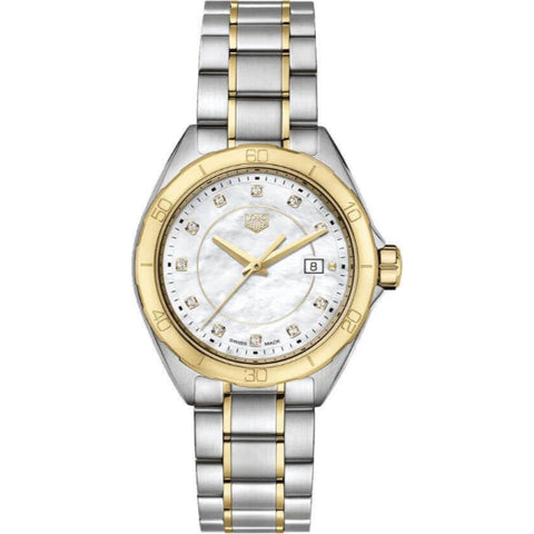Brand New Authentic Tag Heuer Formula 1 Quartz 32mm Diamond Dial Women's Watch Model WBJ1421.BB0648. Stainless Steel case with Two-Tone Yellow Gold Plated & Stainless Steel watch band. Deployment with Push Button and Foldover clasp. Fixed bezel. Dial description: Yellow Gold Tone Hands and Diamond Set Hour Marker on Mother of Pearl dial. Battery Operated Quartz movement. Pull/Push crown. Scratch Resistant Sapphire crystal. Case size: 32mm. 100 Meters - 330 Feet water resistant. 2 year warranty.