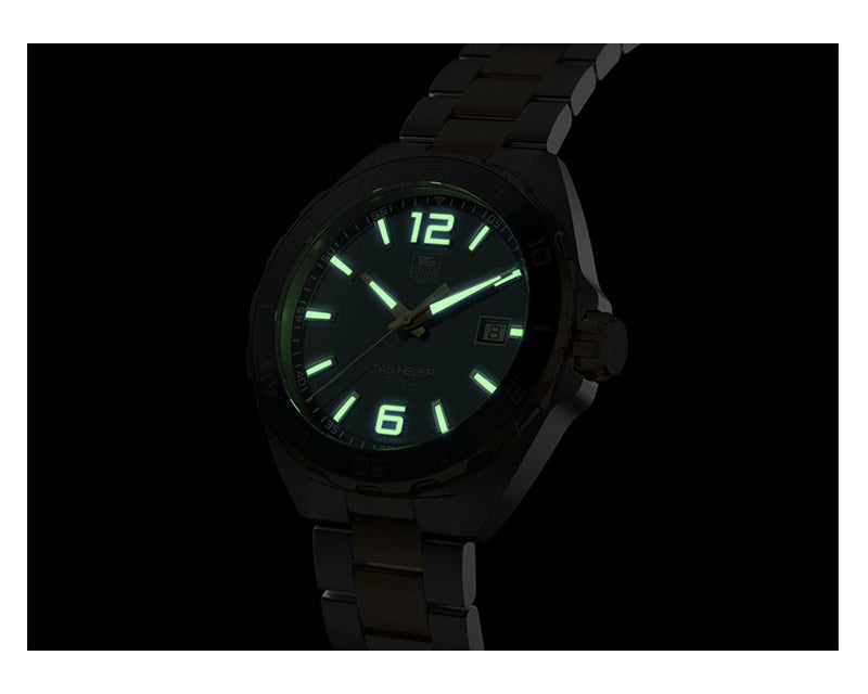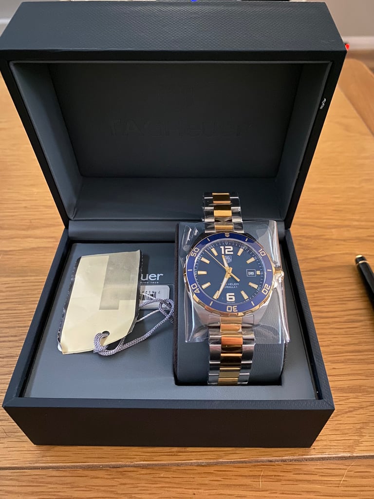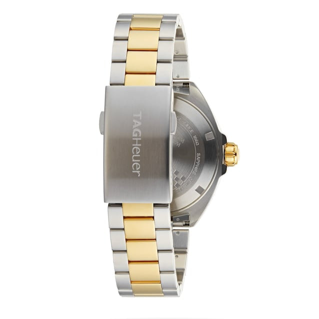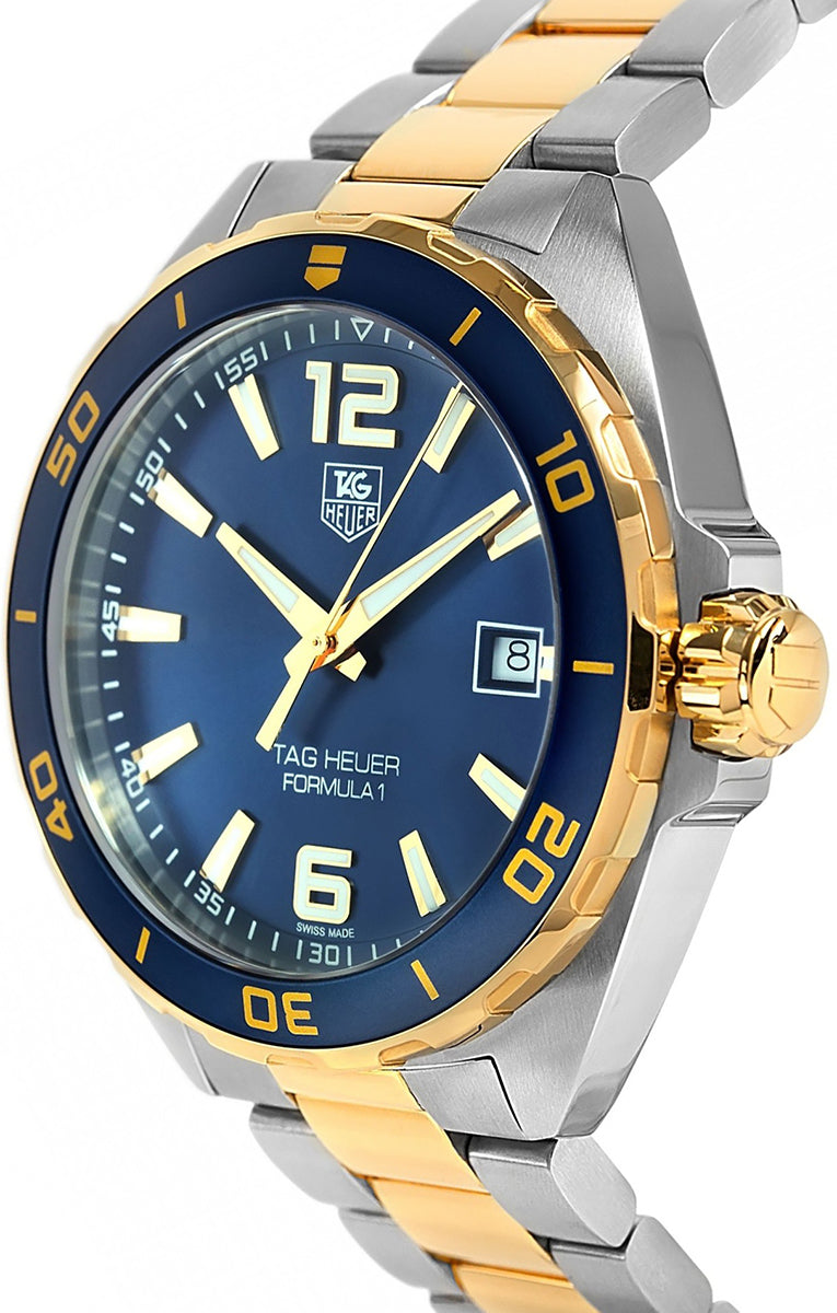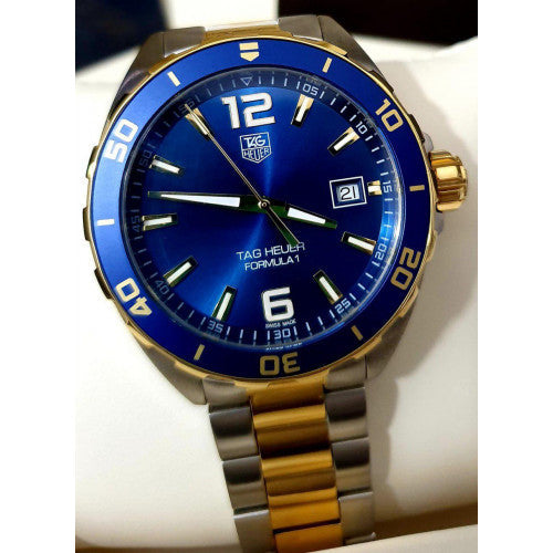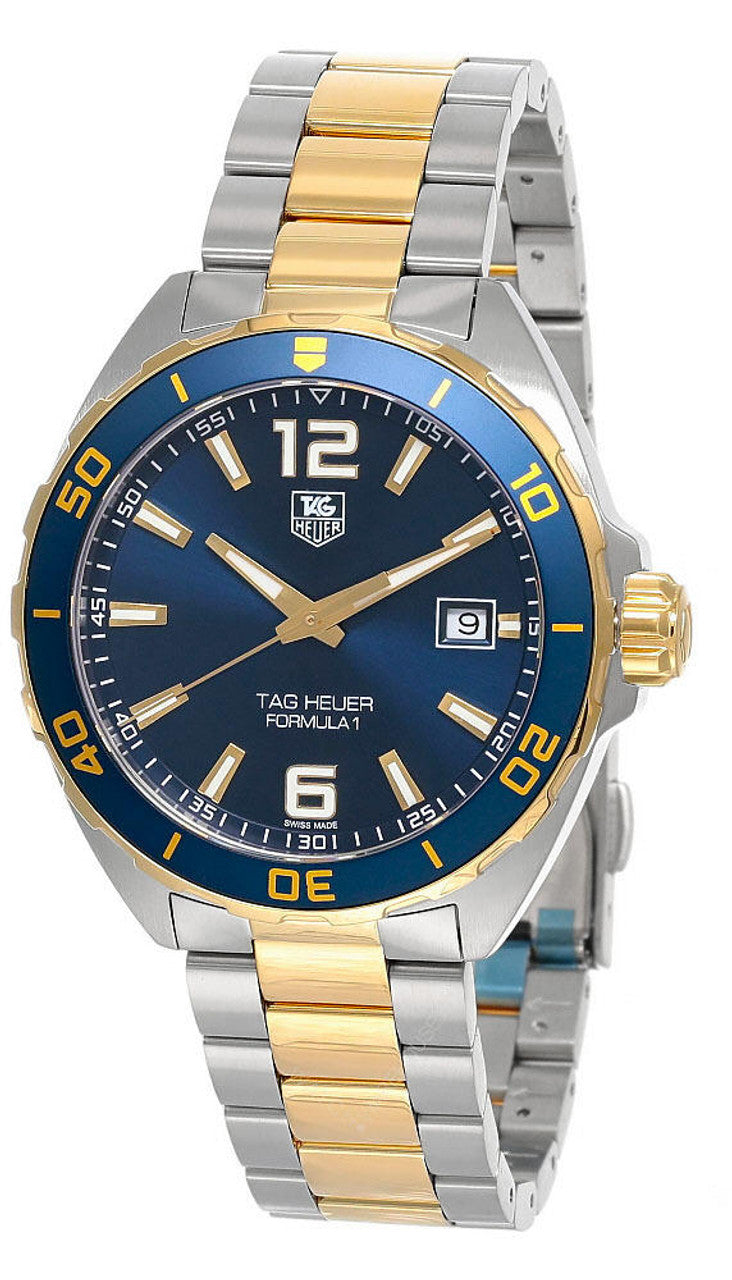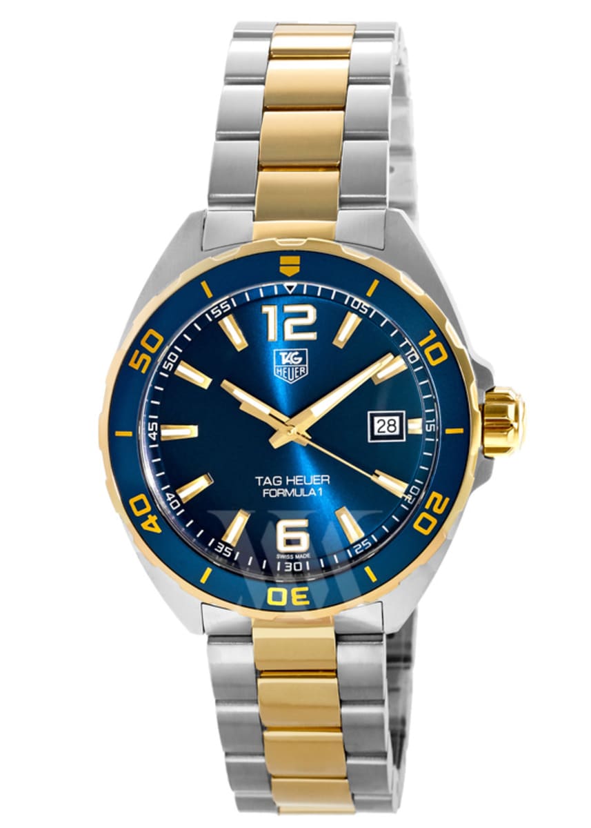 Stainless steel case with a two-tone (silver-tone and yellow gold-plated) stainless steel bracelet. Unidirectional rotating yellow gold-plated stainless steel with a blue top ring bezel. Navy blue dial with luminous yellow gold-tone hands and index hour markers. Arabic numerals mark the 6 and 12 o’clock positions. minute markers around the outer rim. Dial Type: Analog. Luminescent hands and markers.Swiss Made Tag Heuer Quartz Movement. Date.