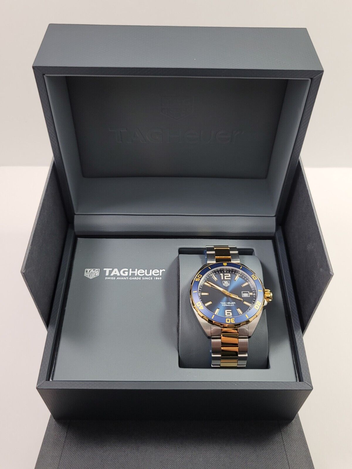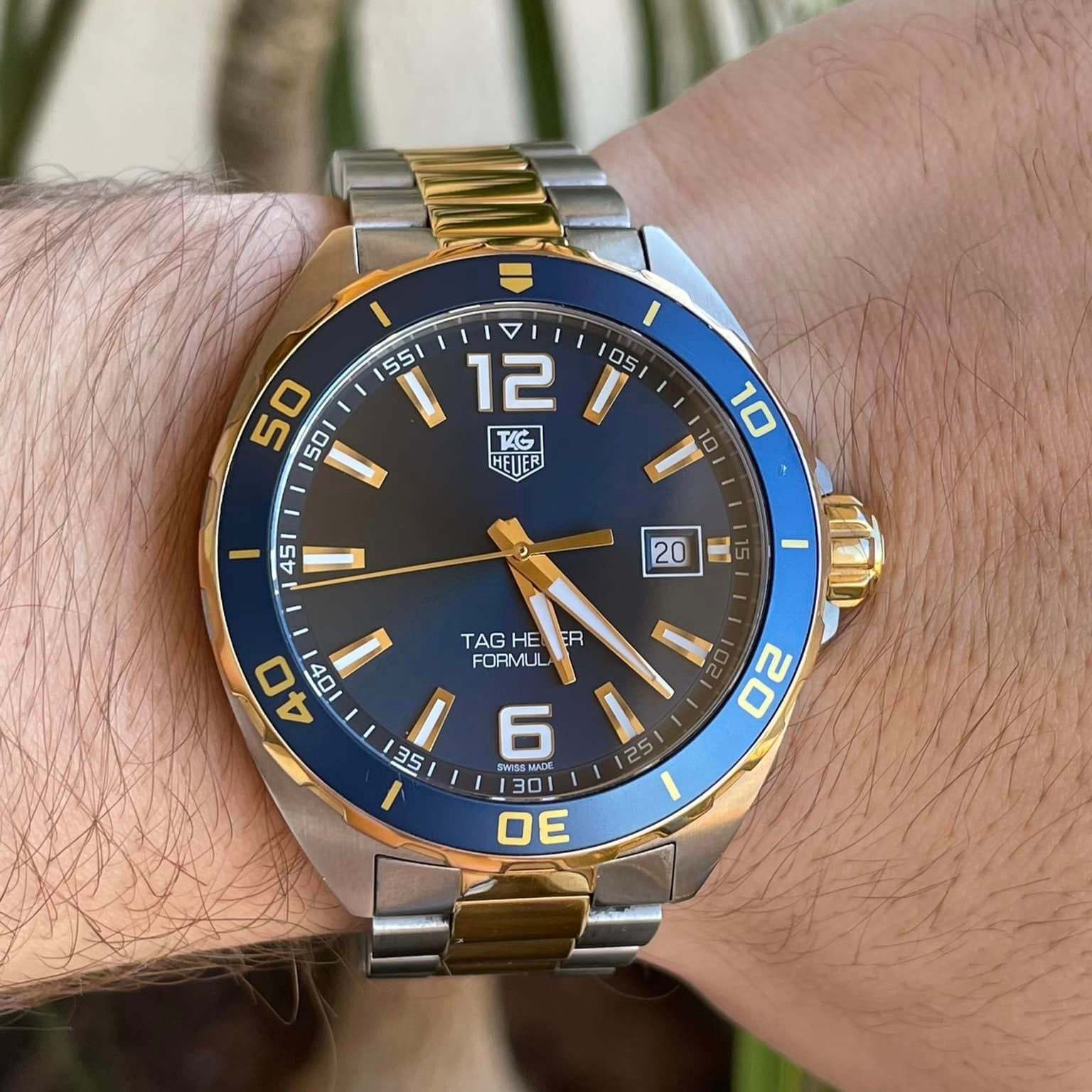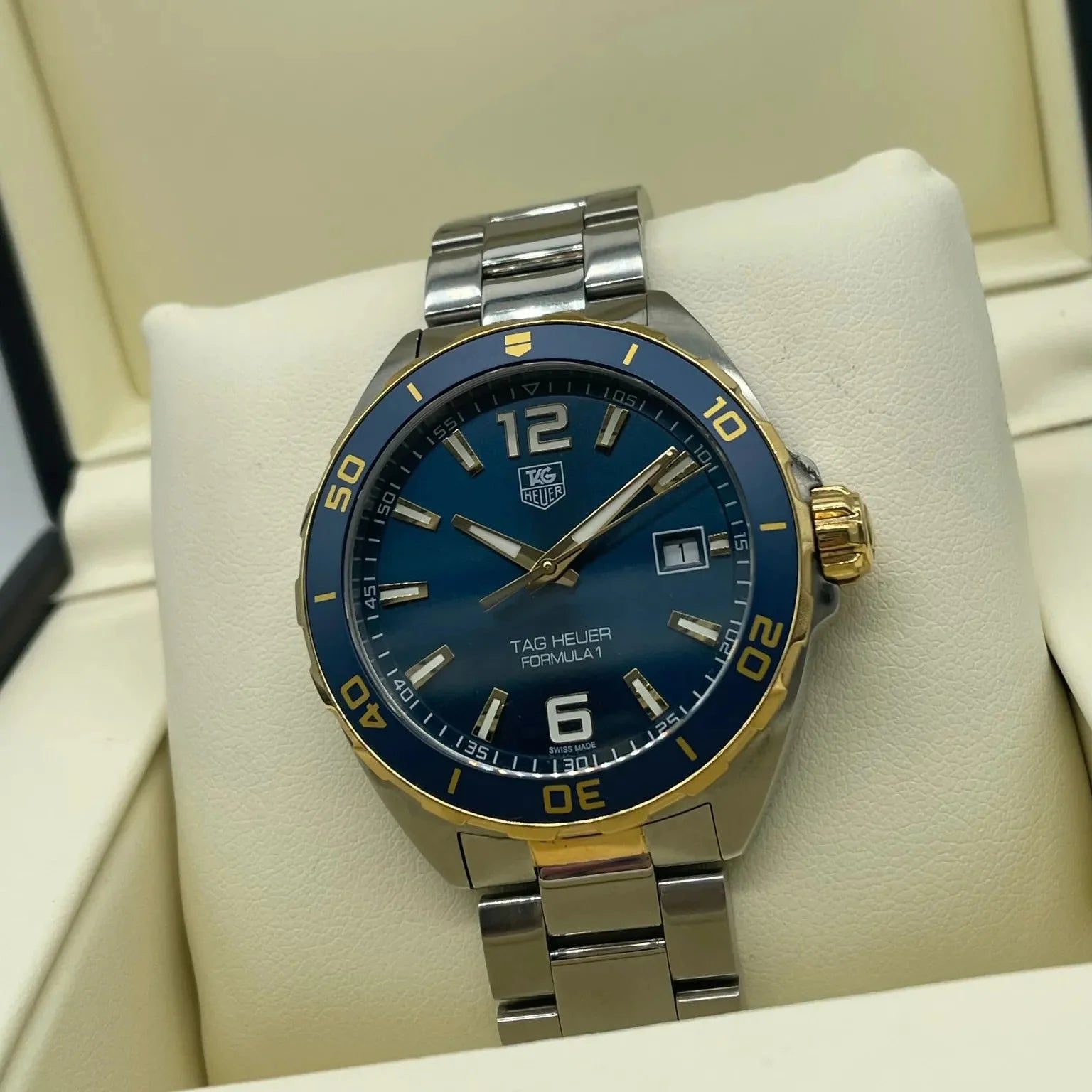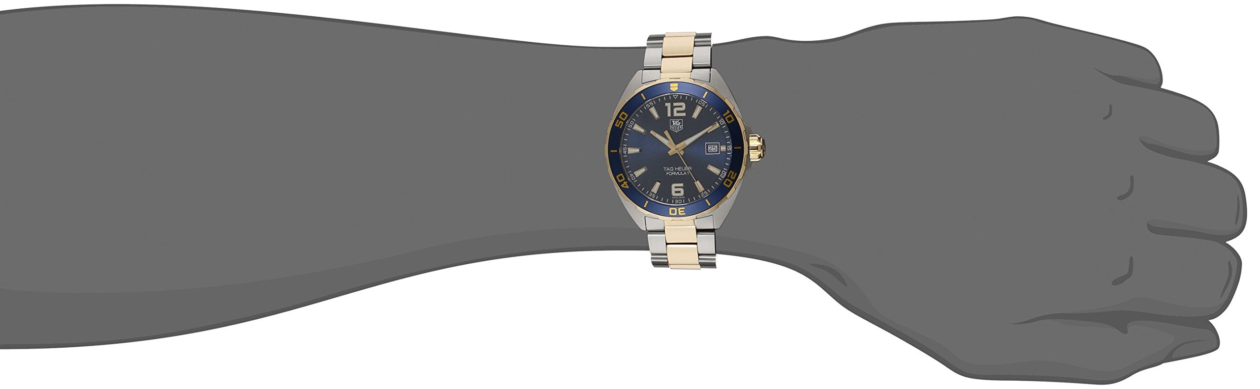 Stainless steel case with a two-tone (silver-tone and yellow gold-plated) stainless steel bracelet. Unidirectional rotating yellow gold-plated stainless steel with a blue top ring bezel. Navy blue dial with luminous yellow gold-tone hands and index hour markers. Arabic numerals mark the 6 and 12 o’clock positions. minute markers around the outer rim. Dial Type: Analog. Luminescent hands and markers.Swiss Made Tag Heuer Quartz Movement. Date.
