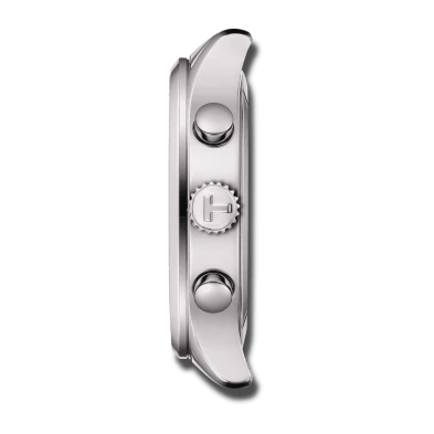 Swiss Quartz. Chronograph movement. Calendar: Date at 4 o'clock. Chronograph sub-dials display: 1/10th of a Second, 60 Second, 30 Minute, Date. Powered by Renata 394 Battery Powered engine. Watch functions: Date, Hour, Minute, Second, Chronograph, Battery End Of Life Indicator. Push-Pull crown. Scratch Resistant Sapphire crystal. Round case shape. Case size: 45mm. Case thickness: 11mm. Solid case back. 100 Meters - 330 Feet water resistant. 2 year warranty. Also known as model: T1166171109200.