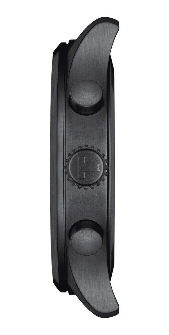 The Tissot T116.617.36.052.00 watch combines a black 45mm round shaped stainless-steel case and black leather strap with a traditional buckle. It has a black analogue dial with two black luminescent hands and a second tracker.