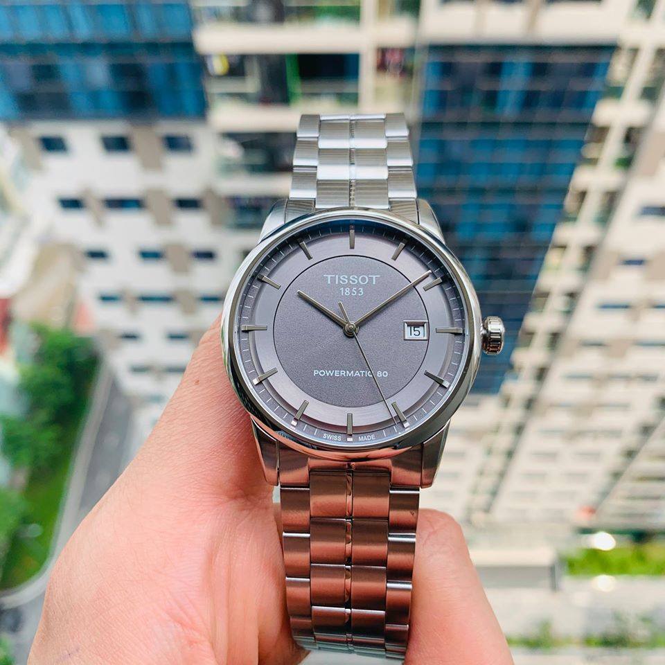 Case thickness: 9.75 mm. Round case shape. Deployment clasp with a push button release. Water resistant at 50 meters / 165 feet. Functions: date, hour, minute, second. Dress watch style. Watch label: Swiss Made. Tissot Luxury Powermatic 80 Anthracite Dial Stainless Steel Men's Watch T0864071106100.