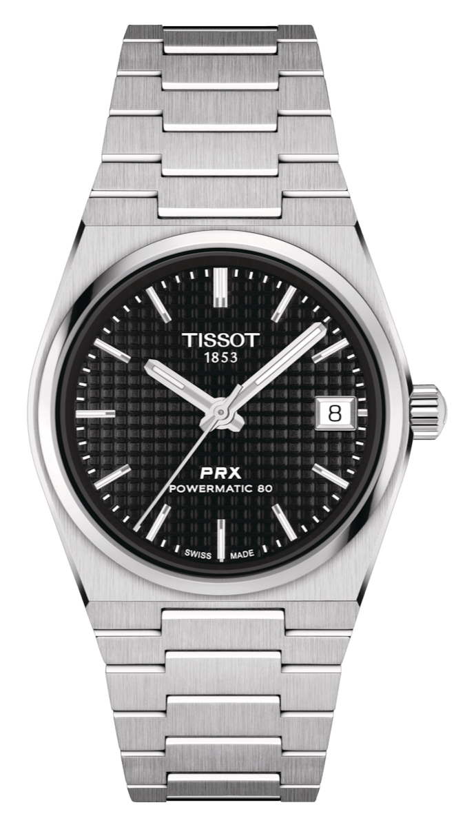 Discover the Tissot PRX 35mm Powermatic 80, a captivating blend of timeless elegance and modern innovation. This 35mm watch features a high-quality steel case and a sleek black dial, reimagining its iconic 1978 roots. The distinctive waffle dial pattern adds a touch of sophistication and sets the automatic model apart. Water-resistant up to 100 meters and equipped with a Nivachron™ balance hairspring, the PRX is a versatile piece for discerning watch enthusiasts. The satin-finish steel bracelet with a triple-blade folding steel clasp ensures a comfortable fit. Embrace the allure of the Tissot PRX 35mm Powermatic 80 in black.