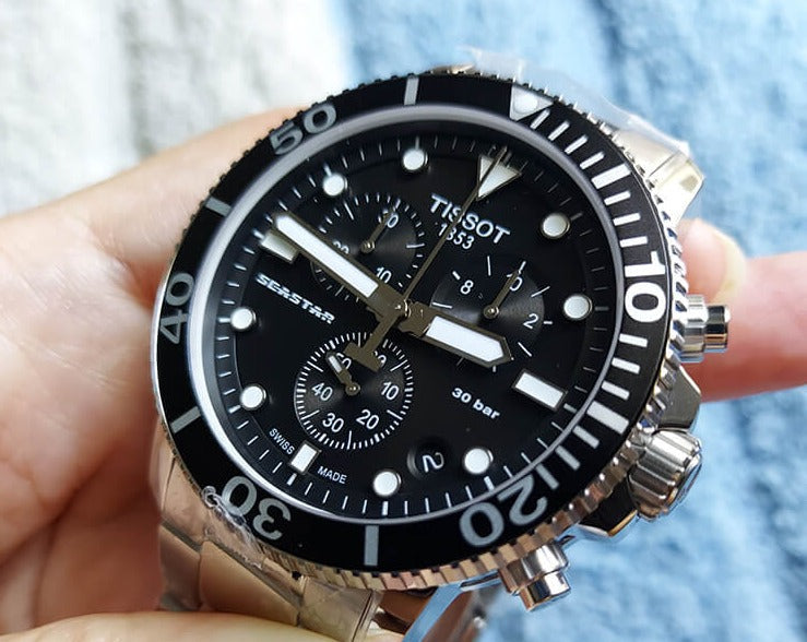 Introducing the Tissot Seastar 1000 Chronograph Watch for men. Featuring a black dial and a silver steel strap, this watch is both stylish and functional. With the ability to withstand depths of up to 1000 feet, this watch is perfect for any water adventurer. Stay on time and on trend with this Tissot timepiece.