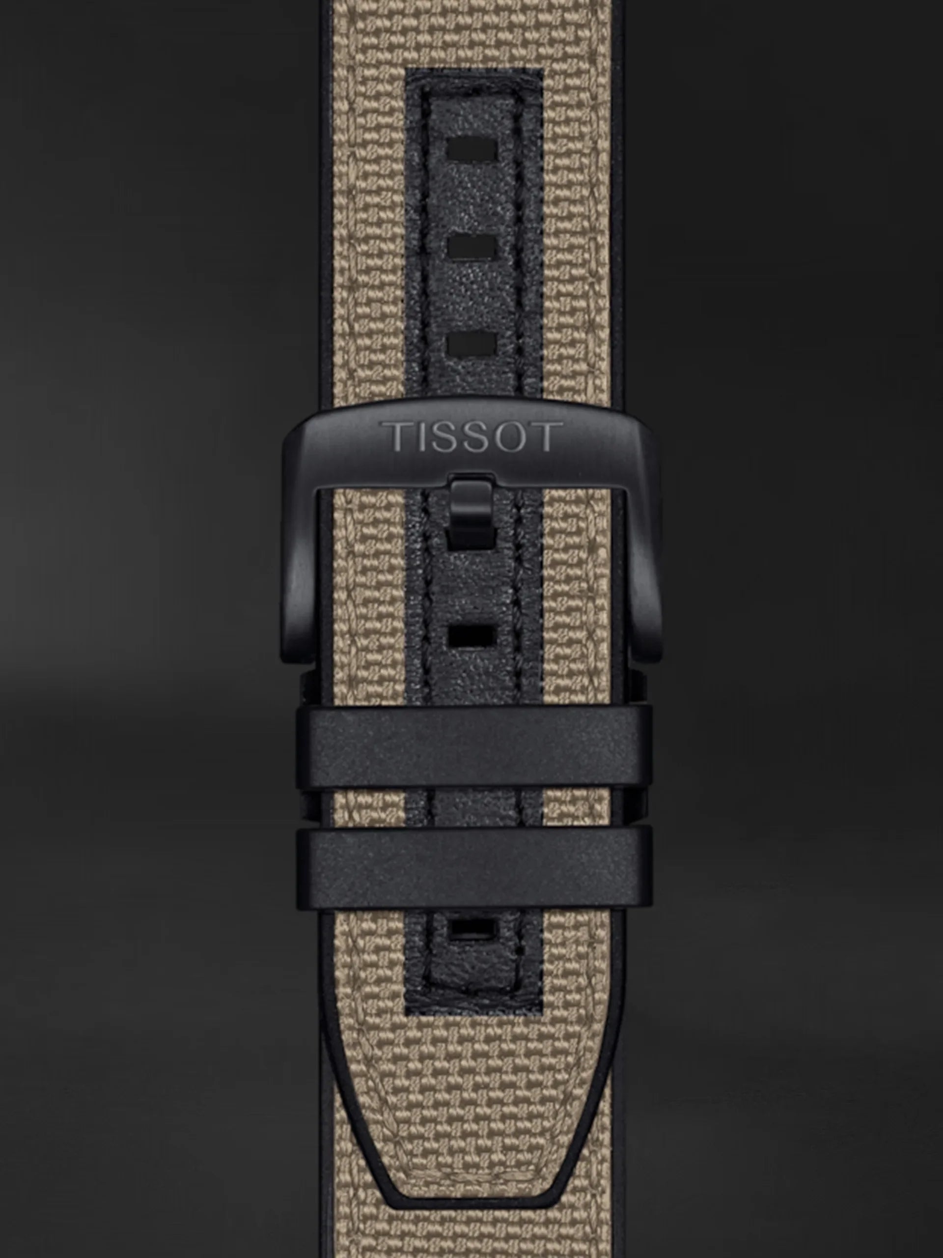 Black PVD stainless steel case with a black leather strap with a (stiched) beige textile top. Fixed black PVD bezel with a black aluminium ring showing tachymeter markings. Black dial with luminous yellow gold hands and index hour markers. Minute markers around the outer rim. Dial Type: Analog. Luminescent hands and markers. Date display at the 6 o'clock position. Chronograph - three sub-dials displaying: 60 second, 30 minute and 1/10th of a second. ETA Caliber G10.212 quartz movement.