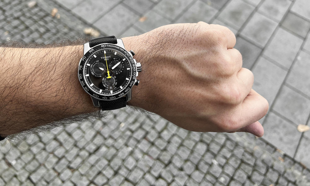 The Tissot T125.617.17.051.02 watch combines a 46mm round shaped stainless-steel case and black leather strap with textile detailing and a traditional buckle. It has a black analogue dial with two black luminescent hands with a yellow second tracker. Date is visible at position 6 with black chronograph sub dials and a tachymeter scale on the bezel, which is protected beneath sapphire crystal glass. Power is generated by the quartz movement. This model also has a water resistance of up to 100 metres.