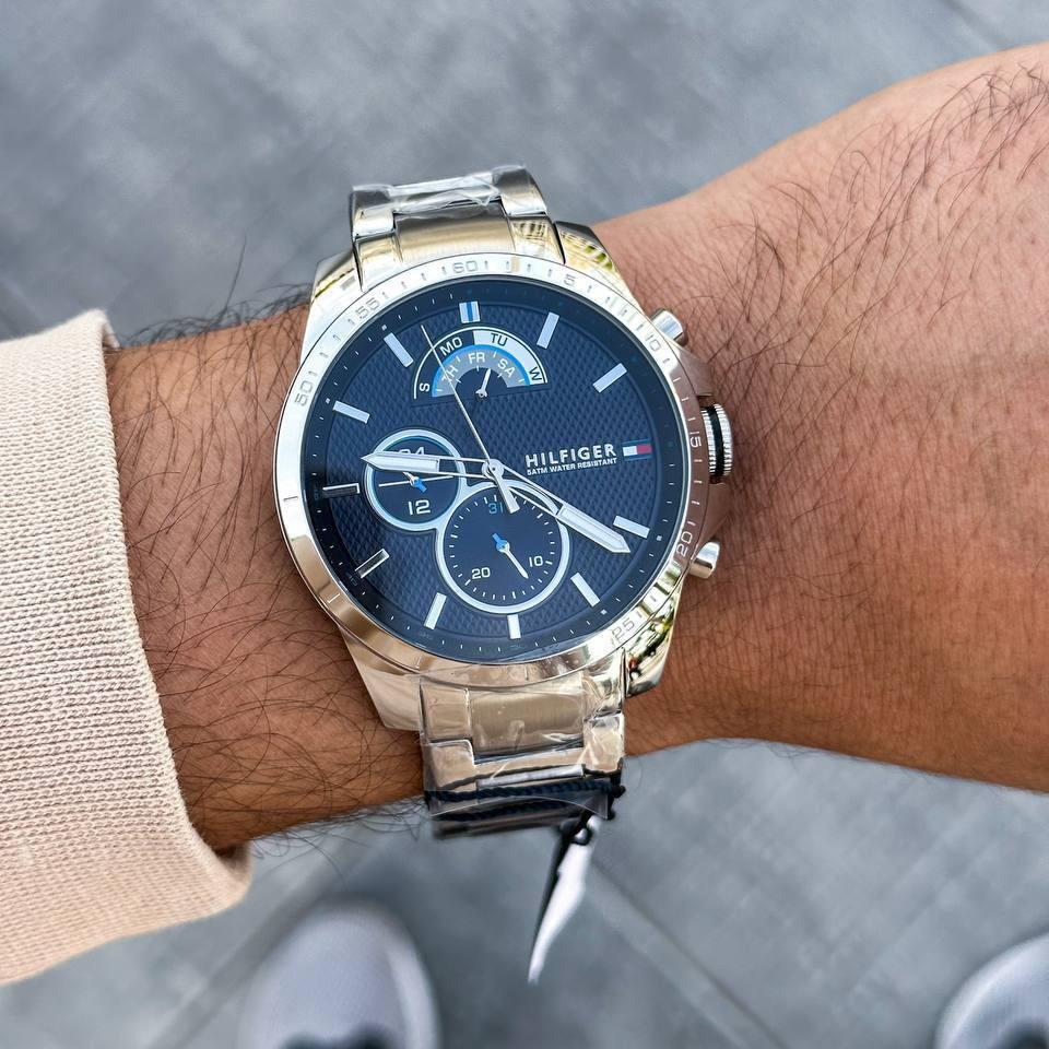 Distinctive textures add eye-catching appeal to this cool, confident multi-function men's watch in solid stainless steel. Featuring a protected crown with etched flag/iconic stripe detail, and sport bezel, the 46mm case is presented on an H-link bracelet with a bold middle row of vertically textured links.