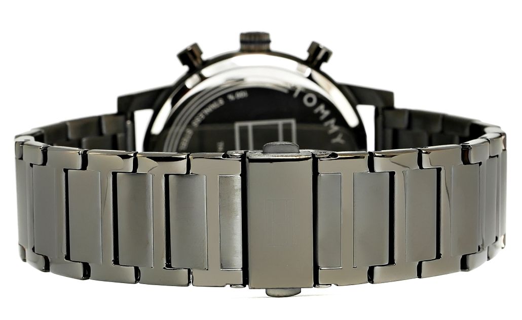 This Tommy Hilfiger watch has a stainless steel strap that is attached to the watch by means of pushpins. Folding Clasp with Pushbuttons. The strap has a straight mount which means that this strap is suitable for all Tommy Hilfiger watches with a straight mount. It is fitted with a Gunmetal/Grey Stainless Steel strap and has a Blue Dial. This watch has a chronograph function.