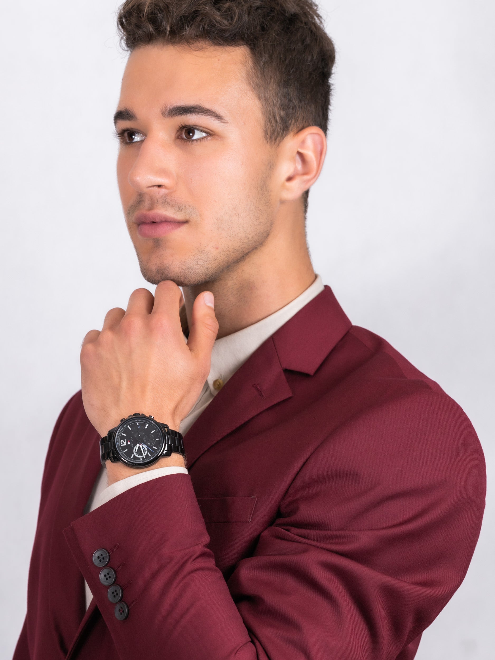The main dial has a three hand analogue display, with three sub dials (chronographs) showing date, day and 24 hour time.