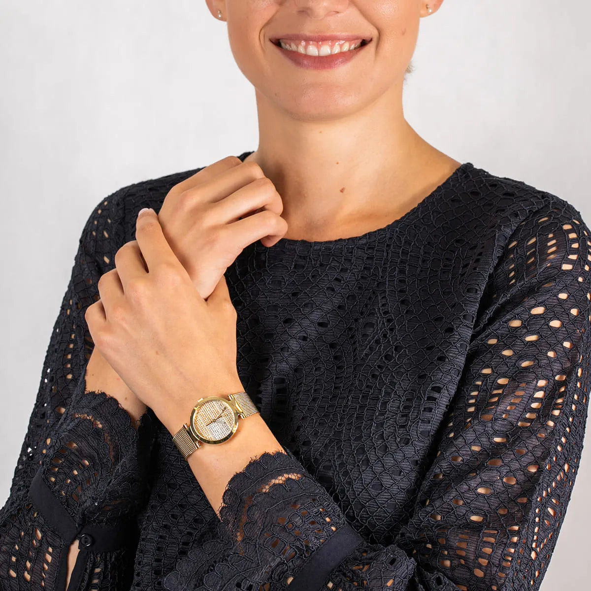 This elegant Tommy Hilfiger watch for women features a sleek gold dial and matching mesh bracelet. Powered by a reliable quartz movement, it offers precise timekeeping for any occasion. The refined design and high-quality materials make it a perfect accessory for any fashion-savvy woman.