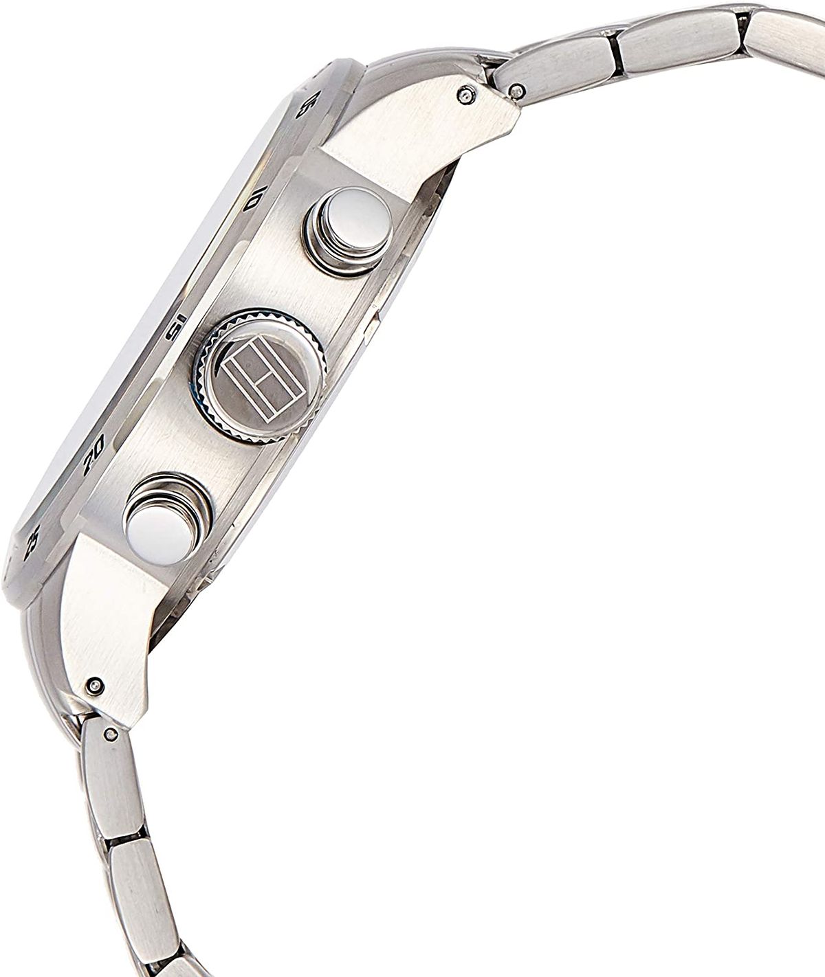 Brand: Tommy Hilfiger, Series: Trent, Gender: Men's, Model: 1791053, Movement: Quartz, Case Size: 46mm, Case Thickness: 11mm, Dial Color: Blue, Case Material: Stainless Steel, Case Shape: Round, Case Back: Solid, Band Material: Stainless Steel, Band Type: Bracelet, Band Color: Silver, Band Width: 22mm, Clasp: Folding Clasp, Crystal: Scratch Resistant Mineral, Bezel: Fixed, Bezel Color: Silver, Bezel Material: Stainless Steel, Crown: Pull / Push, Water Resistance: 50 Meters / 165 Feet, Functions: Chronograph, Date, Hour, Minute, Second, Watch Style: Casual