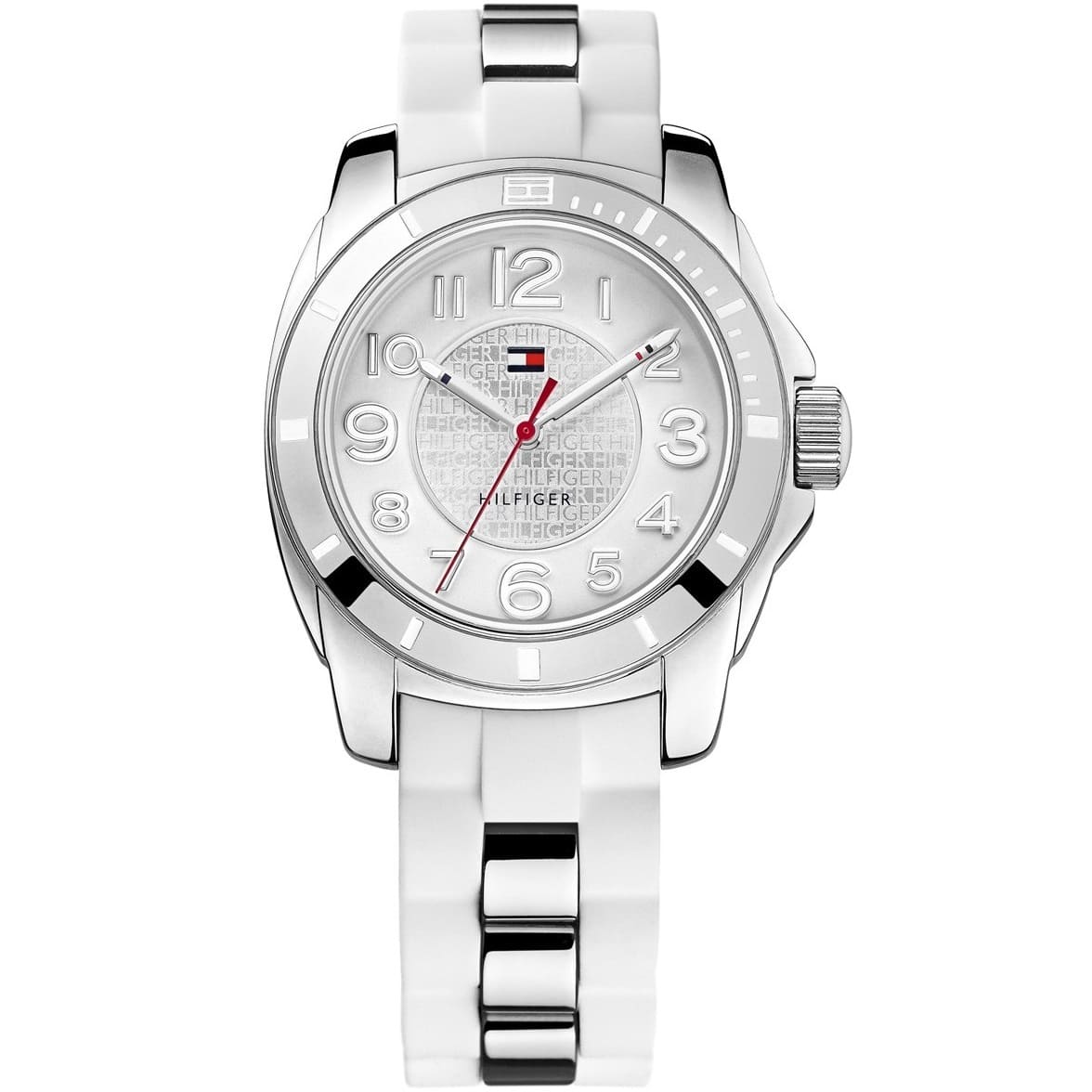 Stainless steel case with a white rubber strap with stainless steel center links. Fixed stainless steel bezel. Silver dial with silver-tone hands and Arabic numeral hour markers. Dial Type: Analog. Quartz movement. Scratch resistant mineral crystal. Solid case back. Case diameter: 38 mm. Case thickness: 10 mm. Round case shape. Tang clasp. Water resistant at 30 meters / 100 feet. Functions: hour, minute, second. Casual watch style. Tommy Hilfiger K2 Stainless Steel and White Rubber Ladies Watch 1781306.