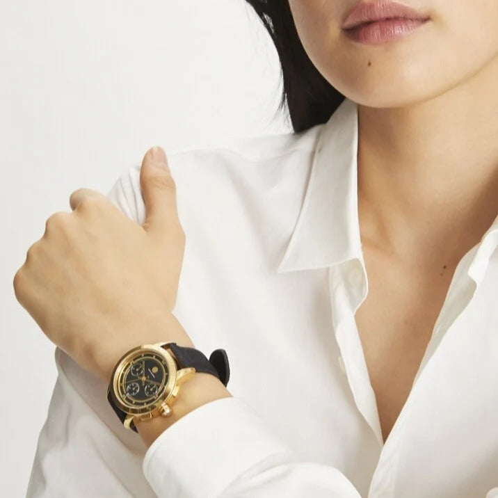 The Tory Burch Miller Chronograph combines classic elegance with sporty sophistication. Featuring a striking blue dial and a textured blue jacquard strap, this women's watch not only captures attention but offers precise chronograph functionality. Its versatile design seamlessly complements both casual and refined outfits, making it an essential accessory for those who value style and performance.