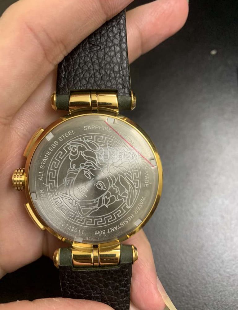 45mm x 12mm Polished Gold PVD Plated 316L Stainless Steel Case with Versace Engraving on Bezel. Solid 316L Stainless Steel Caseback with Medusa Head Engraving. Anti-Reflective Sapphire Crystal Glass. Push-Pull Crown.