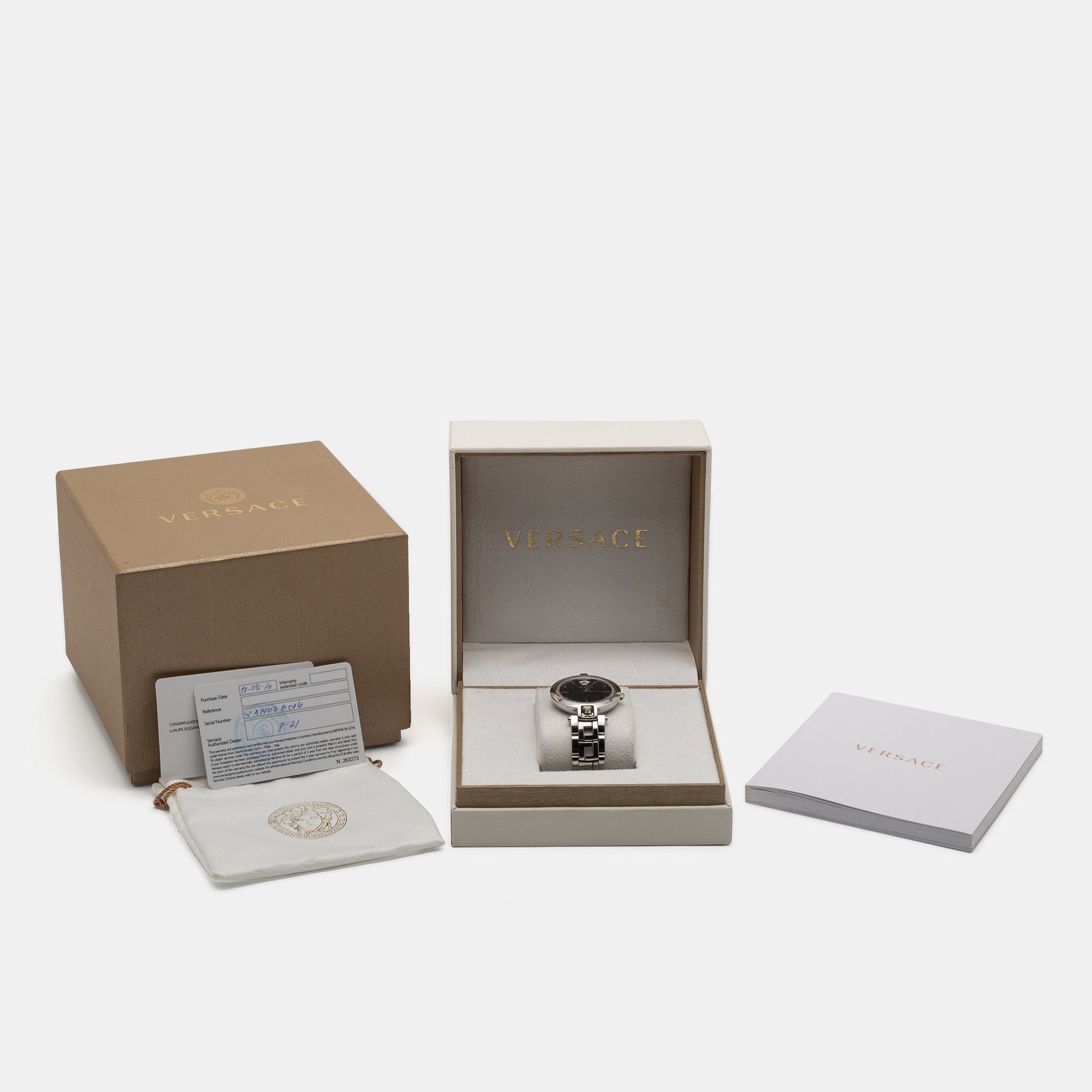 This Versace watch is an elegant piece to complement your everyday looks. Rendered in stainless steel the watch has brand details a link bracelet and a black dial set with silver tone markers.