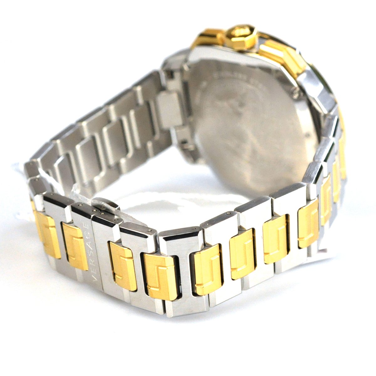 Stainless steel case with a two-tone (silver and gold ion-plated) stainless steel bracelet. Fixed gold ion-plated bezel showing tachymeter markings. Black dial with gold-tone hands and index and Arabic numeral hour markers. Minute markers around the outer rim. The Versace Medusa logo appears at the 12 o'clock position. Dial Type: Analog. Luminescent hands and markers. Date display at the 6 o'clock position. Chronograph - three sub-dials displaying: 60 second, 30 minute and 1/10th of a second. Quartz movement. Scratch resistant sapphire crystal. Pull / push crown. Solid case back. Case size: 44 mm. Case thickness: 12 mm. Octagon case shape. Band width: 20 mm. Deployment clasp with a push button release. Water resistant at 50 meters / 165 feet. Functions: chronograph, tachymeter, luminous, date, hour, minute, second. Dress watch style. Watch label: Swiss Made. Versace Dylos Chronograph Black Dial Men's Watch VQC100016.