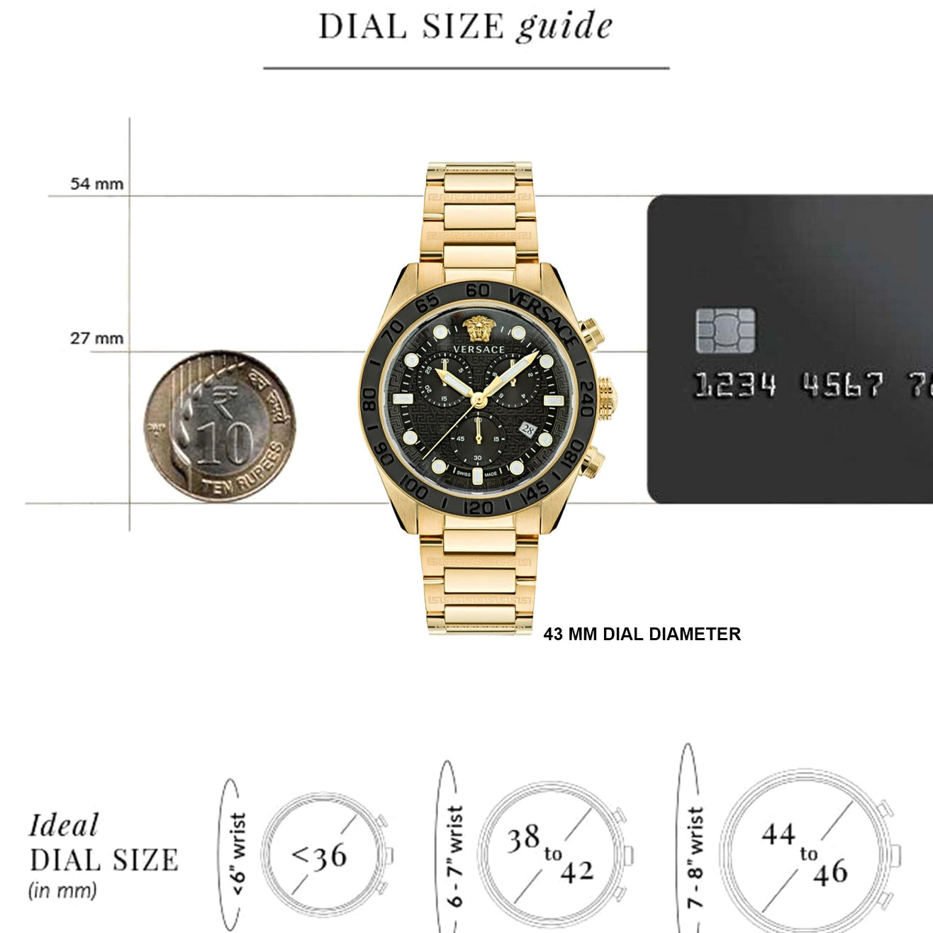 - Black dial with a date window at 4 o’clock, a gold-tone Medusa-head embellishment at 12 o’clock, a Greca-patterned border, and luminous accents