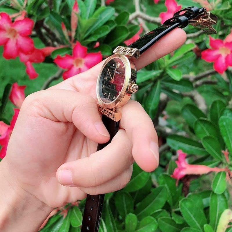 Dial Type: Analog. Quartz movement. Scratch resistant sapphire crystal. Pull / push crown. Solid case back. Round case shape. Case size: 34 mm. Tang clasp. Water resistant at 30 meters / 100 feet. Functions: hour, minute. Meander Series. Dress watch style. Watch label: Swiss Made. Versace Meander Quartz Black Dial Ladies Watch VELW00420.