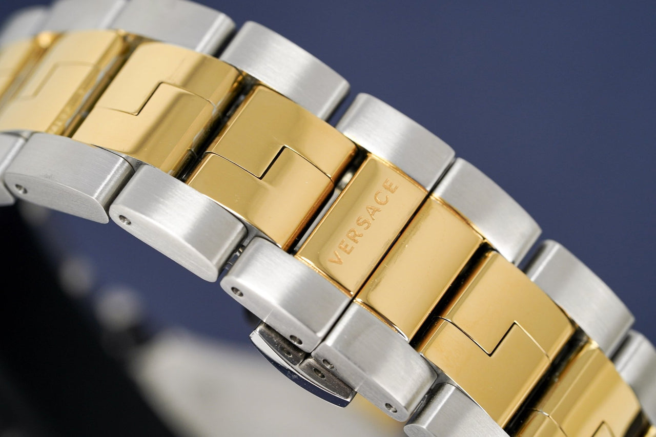 Silver Sunray Dial - Gold PVD Plated 316L Stainless Steel Luminous Markers and Hands - Red GMT Hand - Date Window at 3 O'Clock with Versace Medusa Logo at 12 O'Clock