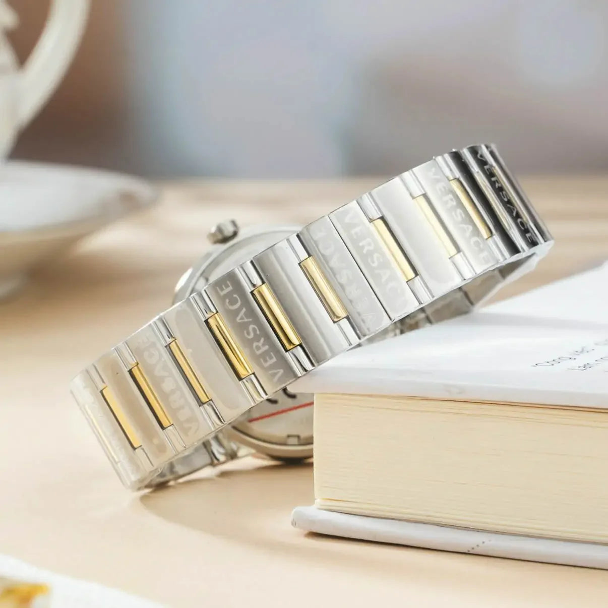 Elevate your style with the Versace Hellenyium Green Dial Two Tone Steel Strap Watch for Women - VEVH00620. This stunning timepiece features a striking green dial and luxurious two tone steel strap, bringing together fashion and function. Own the spotlight with this elegant and versatile watch.