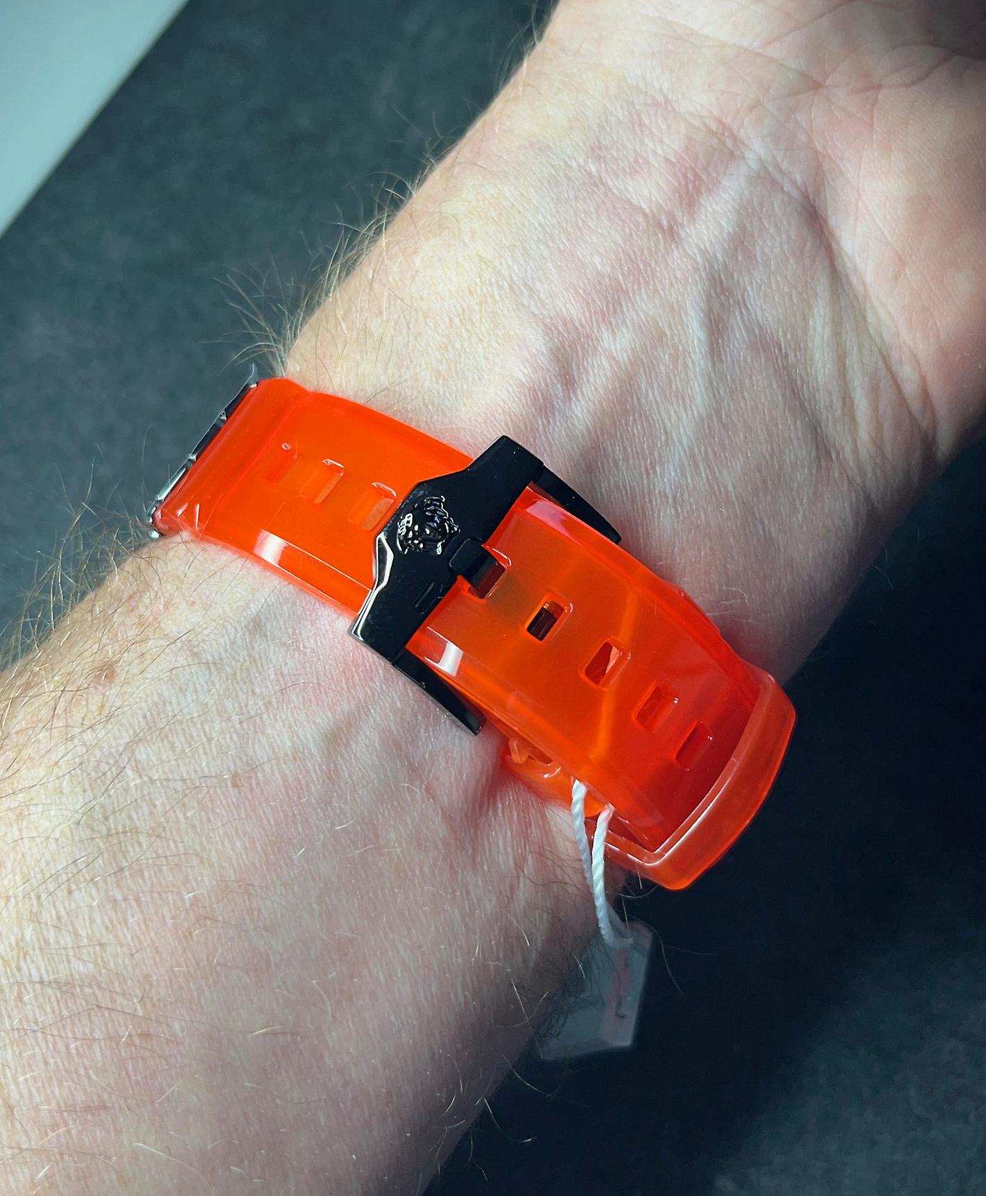 Blue polycarbonate case with a orange silicone strap. Fixed blue polycarbonate bezel. Blue dial with black hands and index hour markers. Minute markers around the outer rim. Medusa head marks the 12 o'clock position. Dial Type: Analog. Luminescent hands and markers. Date display at the 6 o'clock position. Chronograph - two sub-dials displaying: 60 second and 30 minute.- 44mm Transparent Blue Case
