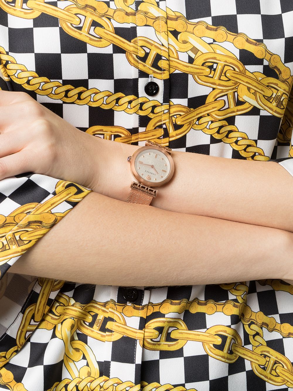 Rose gold ion-plated stainless steel case with a rose gold ion-plated stainless steel mesh bracelet. Fixed rose gold ion-plated bezel. White (Medusa Head) dial with rose gold-tone hands and index hour markers. Dial Type: Analog. Quartz movement. Scratch resistant sapphire crystal. Pull / push crown. Solid case back. Round case shape. Case size: 37 mm. Case thickness: 8 mm. Band width: 18 mm. Fold over slip through clasp. Water resistant at 30 meters / 100 feet. Functions: hour, minute. Meander Series. Casual watch style. Watch label: Swiss Made. Versace Meander Quartz White Dial Ladies Watch VELW00620.