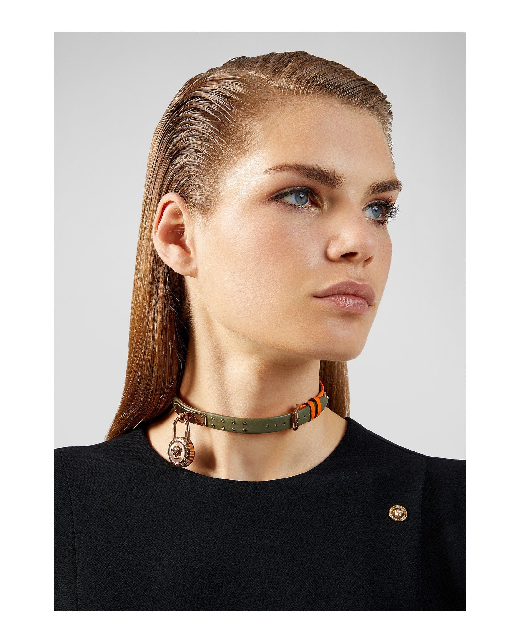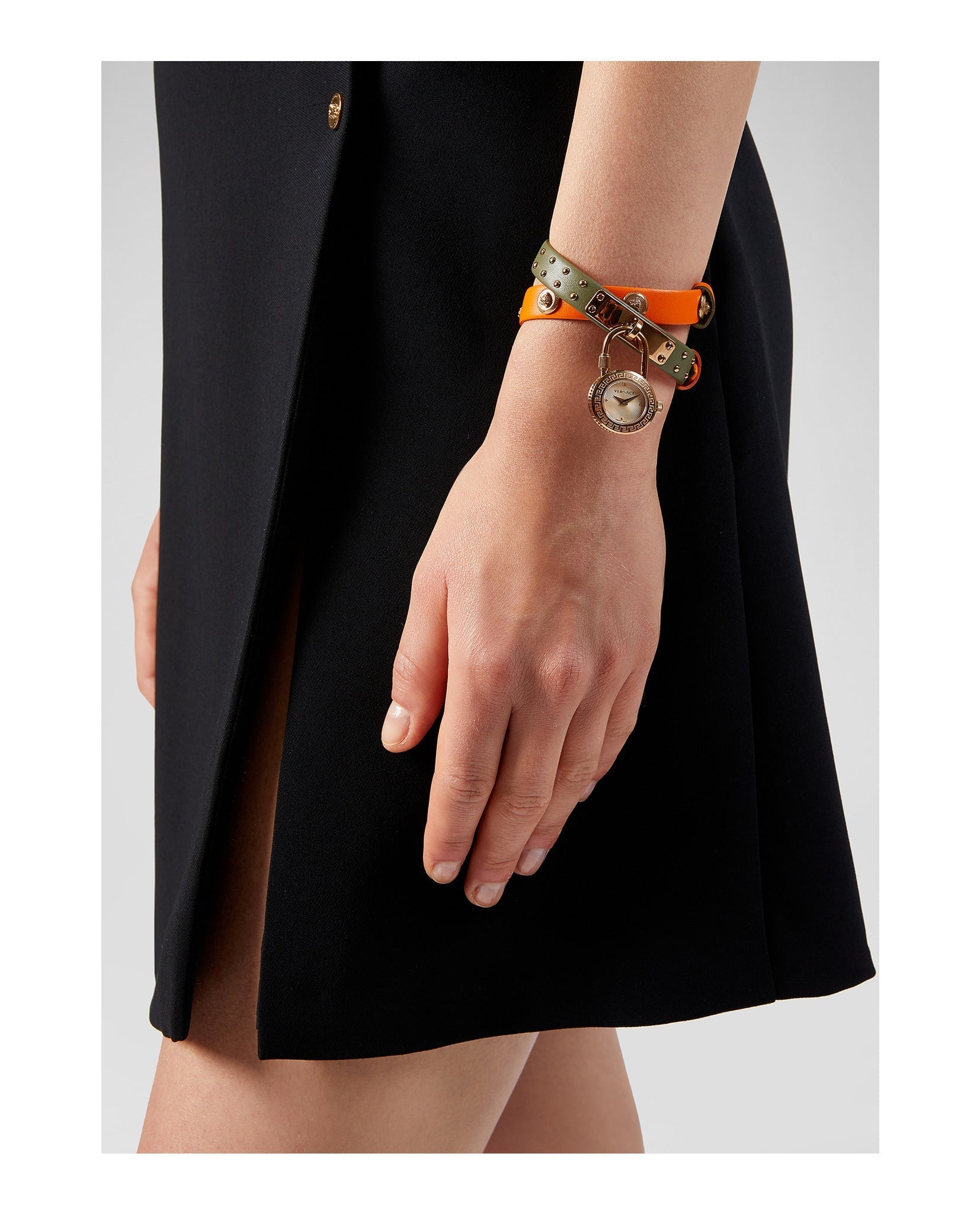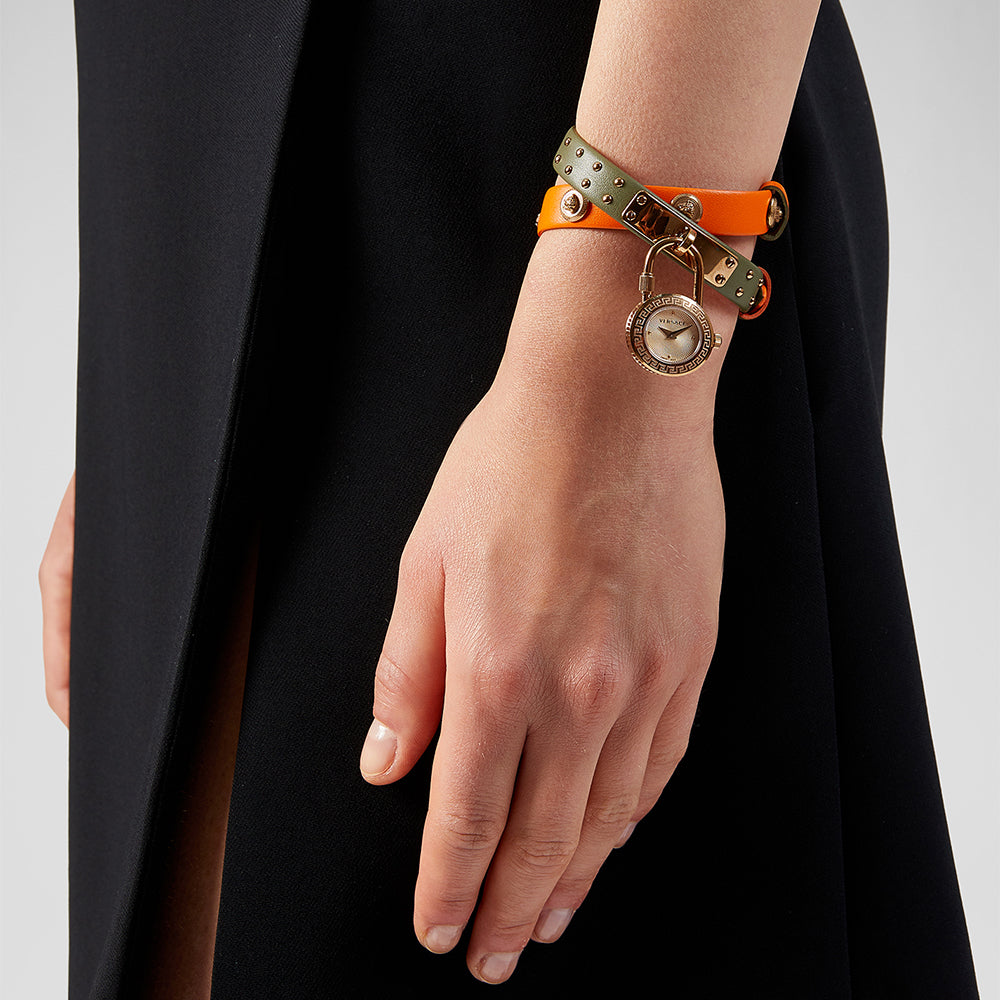 Medusa Lock Icon is the ultimate timepiece accessory thanks to the versatility of the 3 unique ways in which it can be worn. Wear with a single strap for everyday styling, with a double strap for a sophisticated and chic look, or as a collar watch, for those who are innovative and unconventional. The standout feature for this timepiece is given by the padlock, which can be found on Versace Tribute accessories, becoming a highly iconic element that is taken up by the design of the watch from which it takes its name. Two sides make up the case: the clock on the first side, and the Medusa carved on the case-back. The strap is embellished with metallic decorations, round studs and Medusa studs, giving the watch an edgy style.